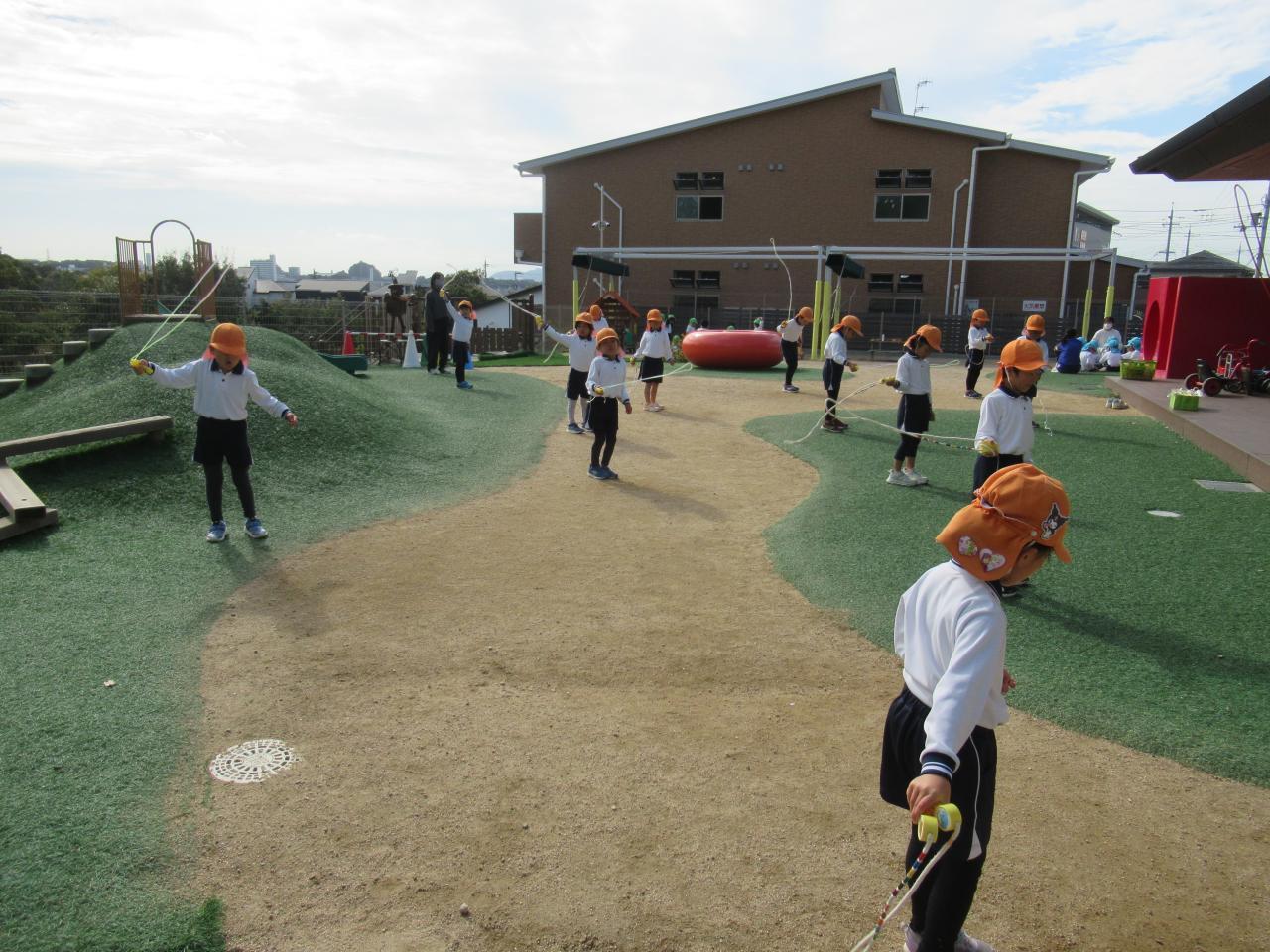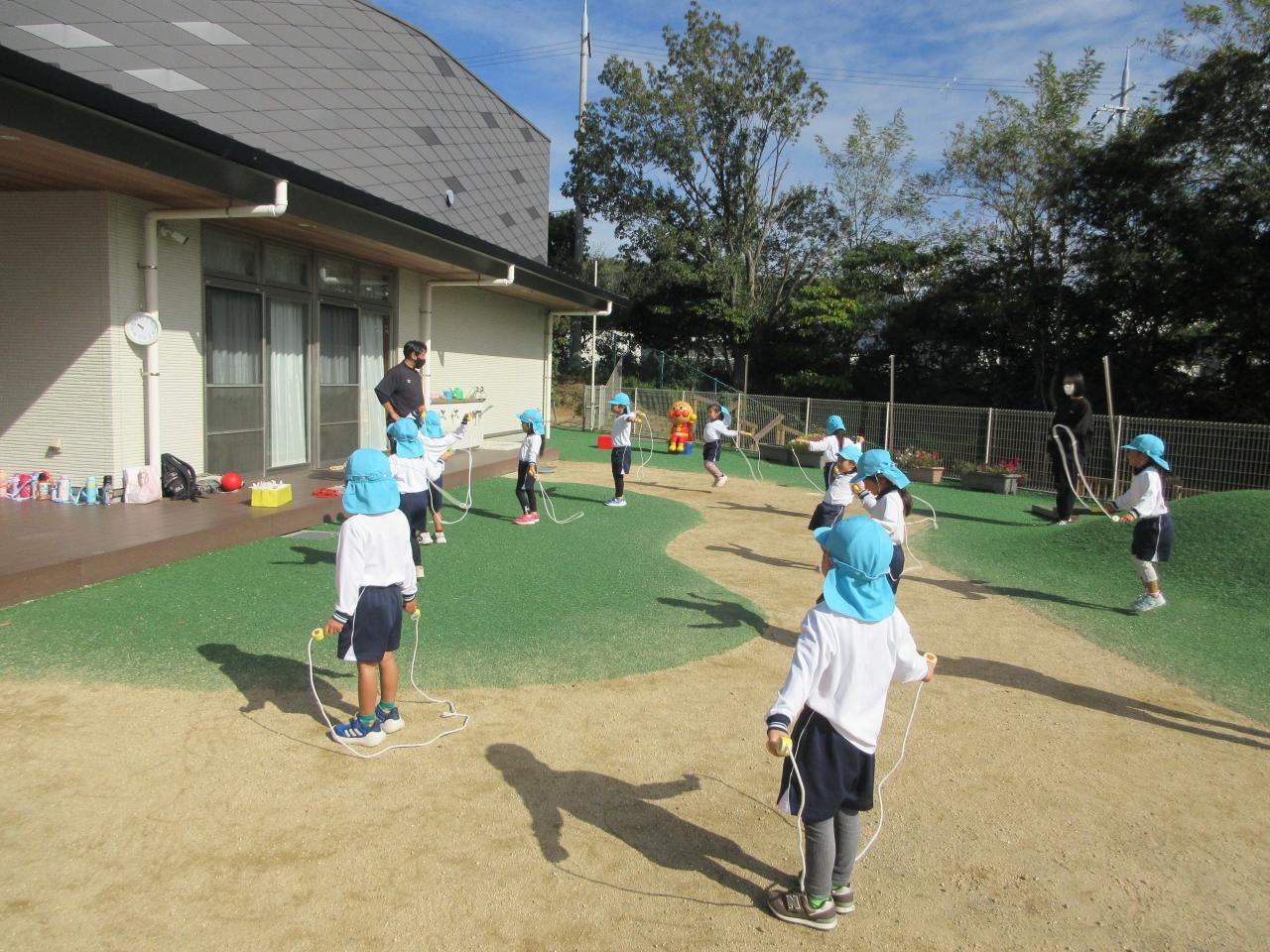 縄跳びをしました。前跳びや後ろ跳び、けんけん跳びに挑戦し、回数ごとにシールをもらいます。「前跳び3回できたから次は7回頑張る!」とたくさん練習に取り組んでいます。また、「この色のシールなに跳び?何回?」とお友だちとも協力をしています。「お外遊びの時に練習しよう!」と、とても張り切っている子どもたちです。