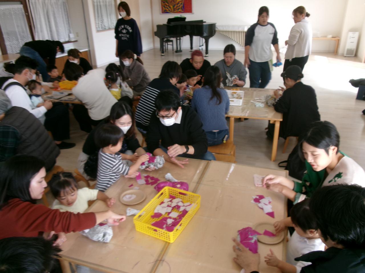 製作では、保護者の方と一緒に、新聞紙を丸めて形を作ったり、折り紙を貼って野菜を作っていくことを楽しんでおり少しずつ出来上がっていくのを見て喜んでいます。