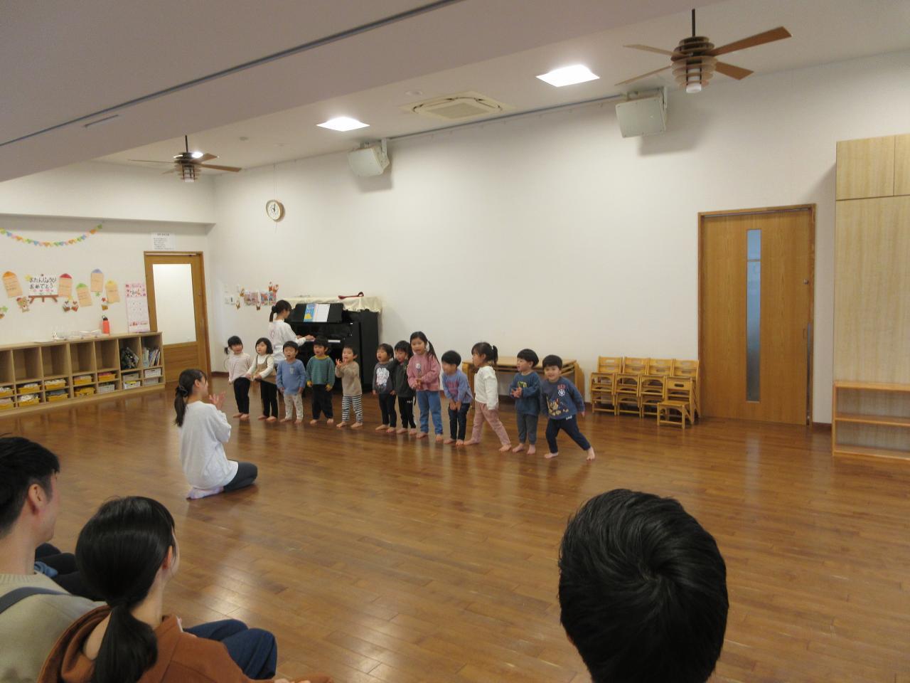 「今日はパパママ来る日!楽しみー!」と朝から心待ちにしていた子どもたち。始まると少し緊張する姿も見られましたが、元気よく朝のお歌をうたっています。