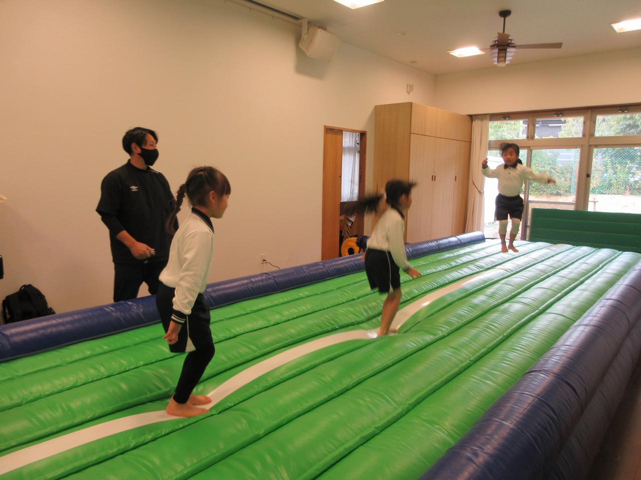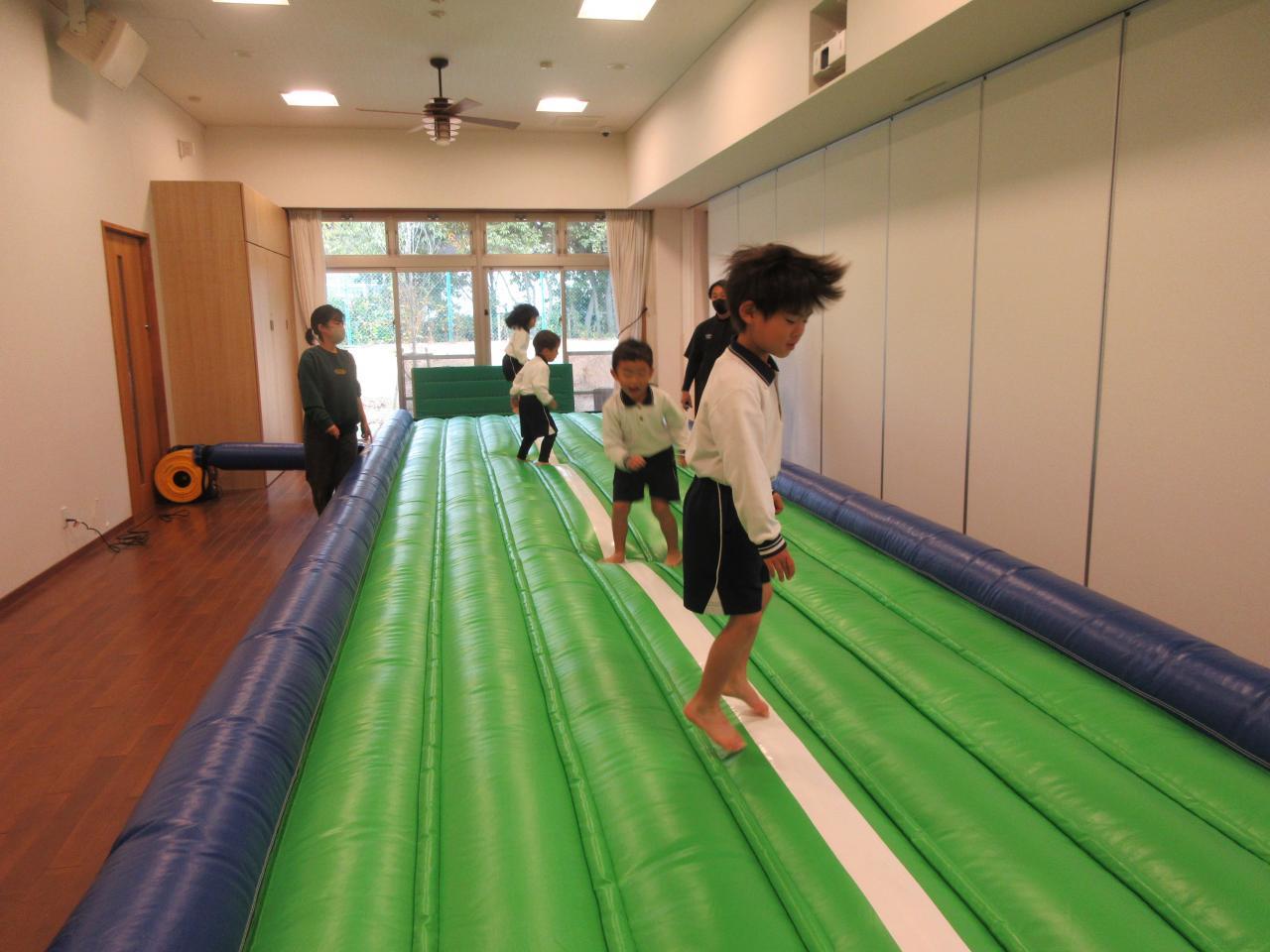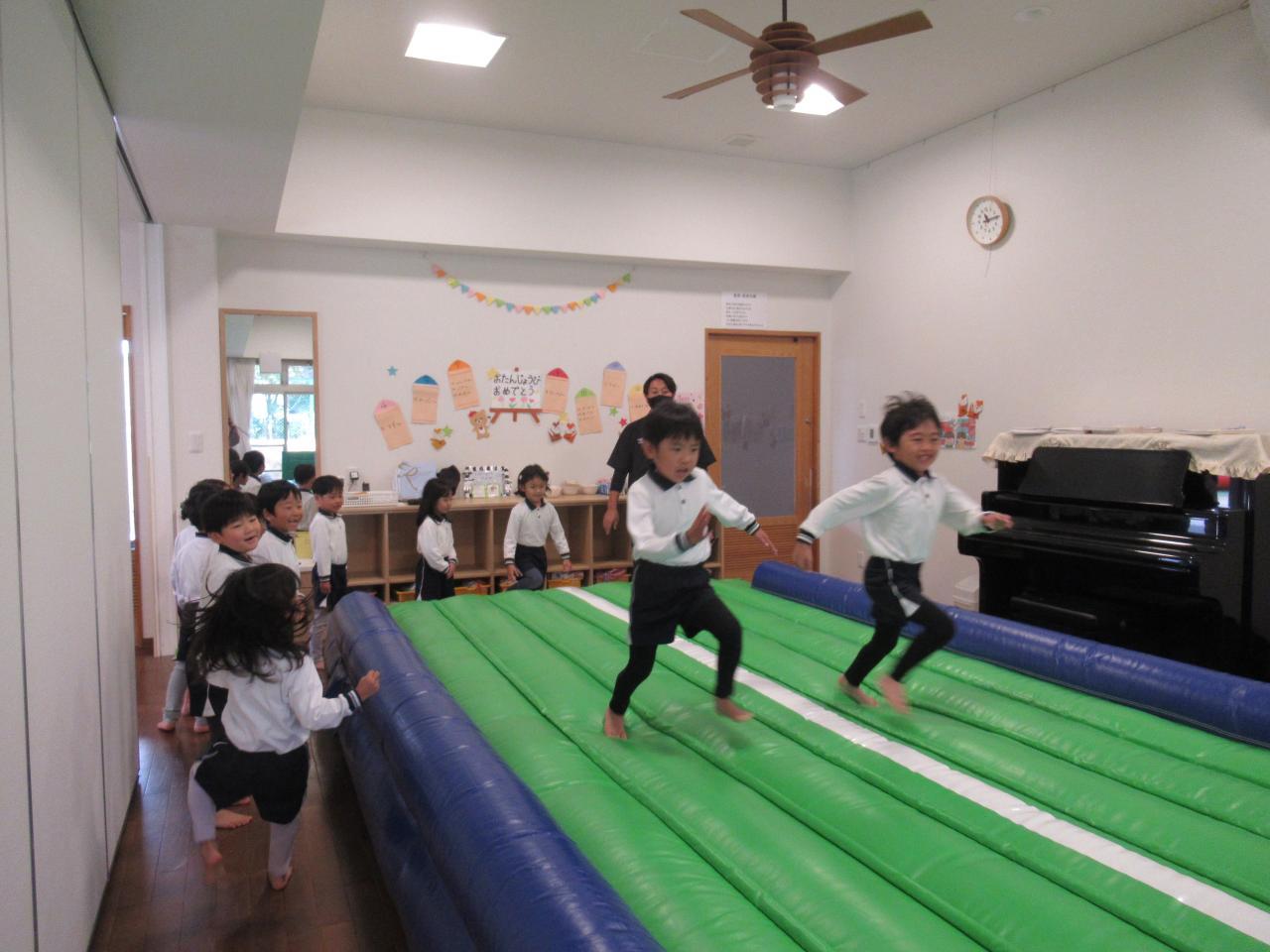 トランポリンの上でグージャンプやペンギン歩き、くま歩きをしました。初めて見る大きなトランポリンに興味津々で、「膨らんだ!」「大きい!」とやりとりする子どもたち。いざ始めると大喜びで、いつものマットとは違う感覚を全身で楽しみました。