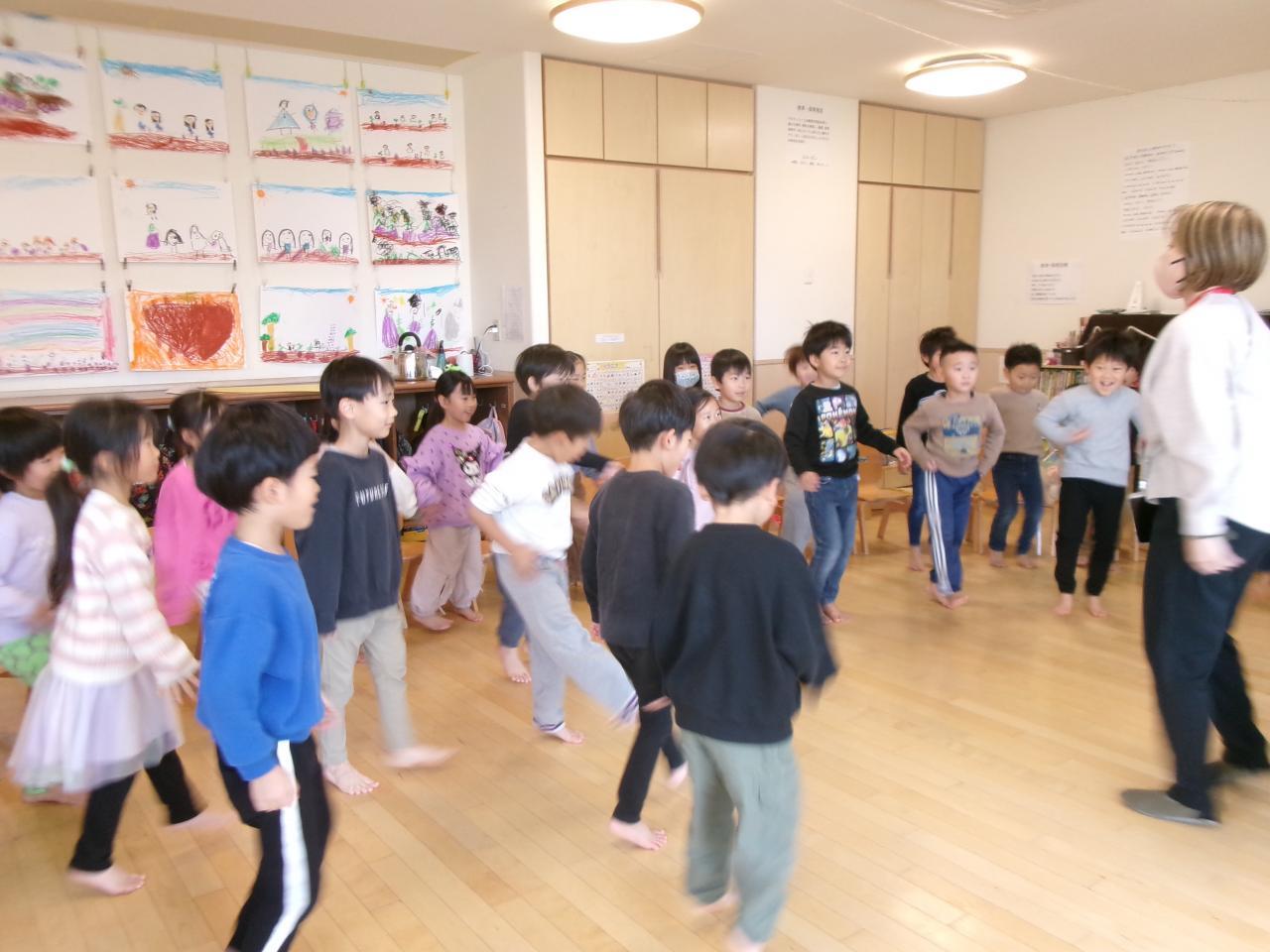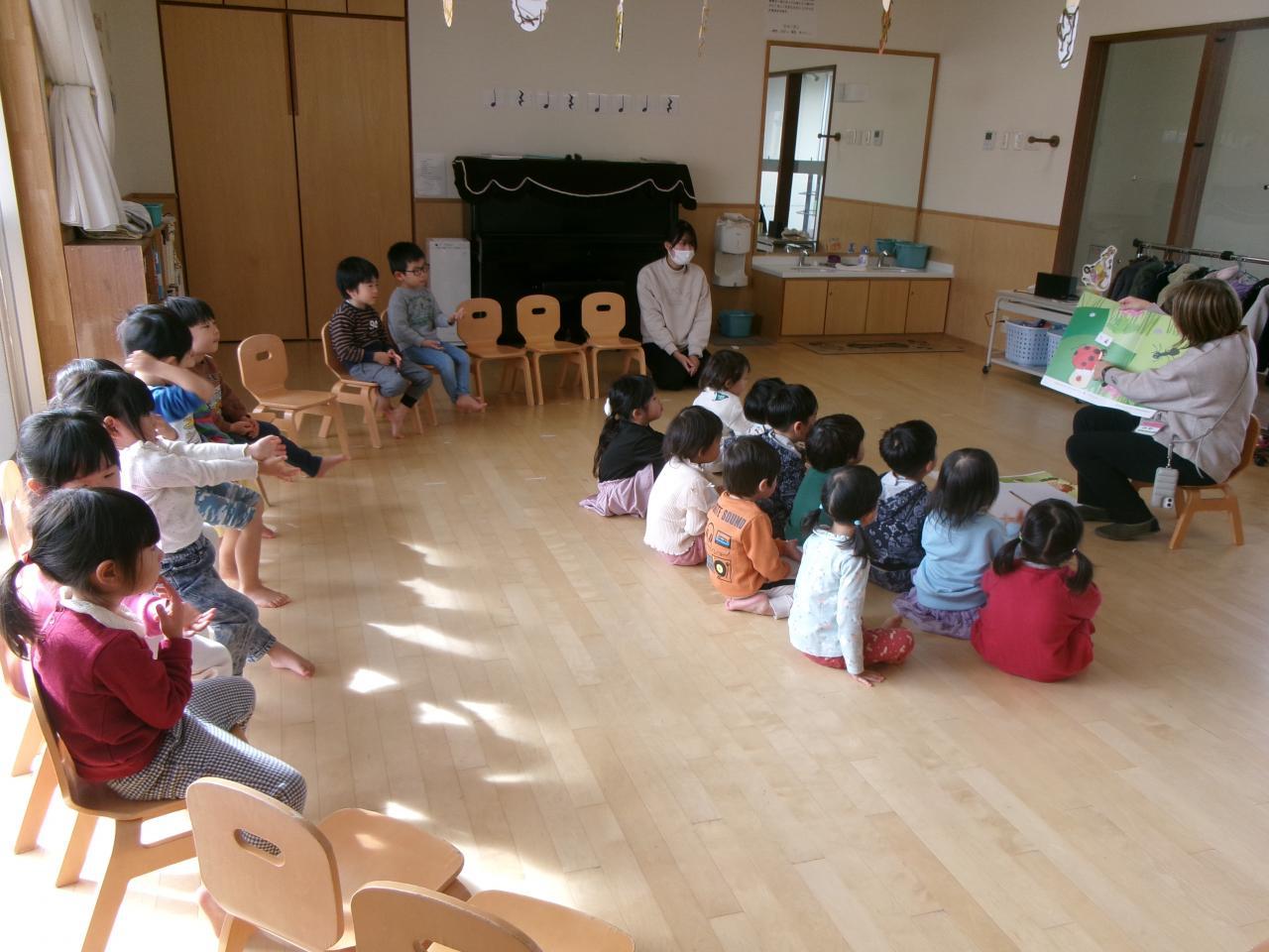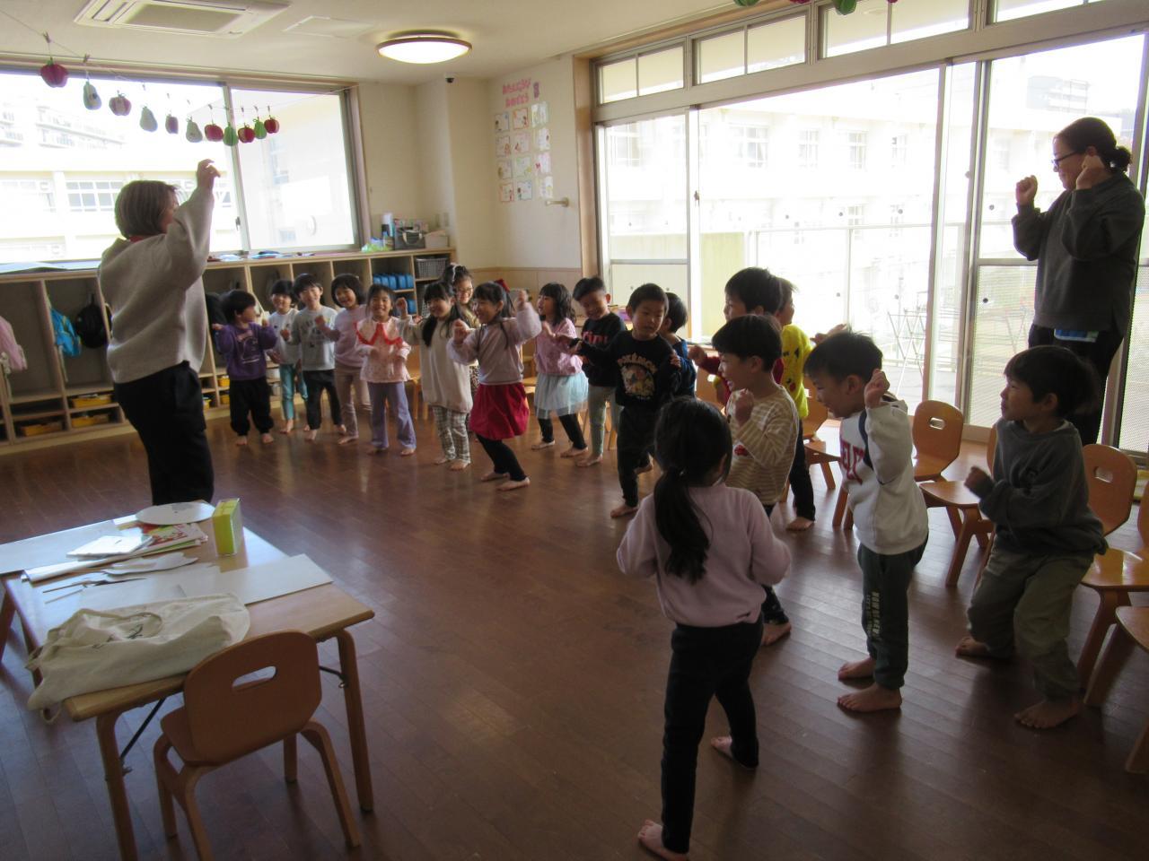 英語の先生との挨拶のやり取りの中で「Hello!」「I'm fine thank you and you?」と進んで返せるようになり上手にやり取りが出来たことを褒めてもらいうれしそうにしている子どもたち。天気や季節の単語の確認の際も自信を持って発音することができています。エクササイズで「まげる・タッチする・振る」の動作の単語を教えてもらい、二グループに分かれて英語の先生の指示をよく聞き体の部位を動かすことが出来るかゲームを行いました。それぞれ聞こえた指示にすぐに体を動かし楽しんでいました。絵本「One Inch Betty」を読んでもらい、お話の中に出てくる昆虫の単語を一緒に発音しながら楽しみました。その後出てきた昆虫の単語を確認し「Bee(蜂)」「Ant(アリ)」「Spider(蜘蛛)」「Butterfly(蝶)」「Beetle(カブトムシ)」のカードをもらい、捕まえたい昆虫を探すゲームを行いました。それぞれの昆虫のカードを持っている子に「Are you ○○?」とカードをもっているか質問し「Yes, I am/ No,I'm not」と持っているか持っていないか上手に答えゲームを楽しんでいました。