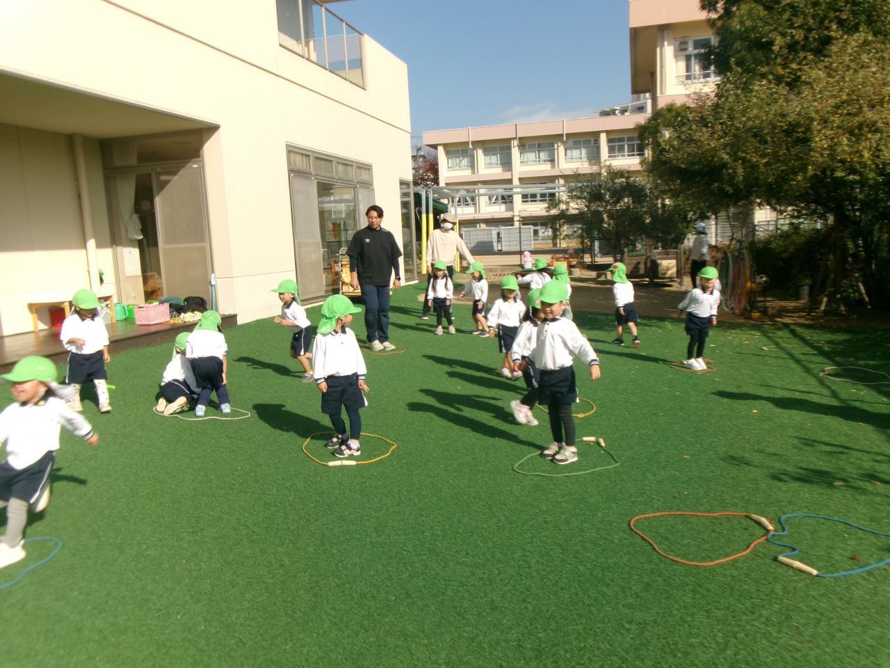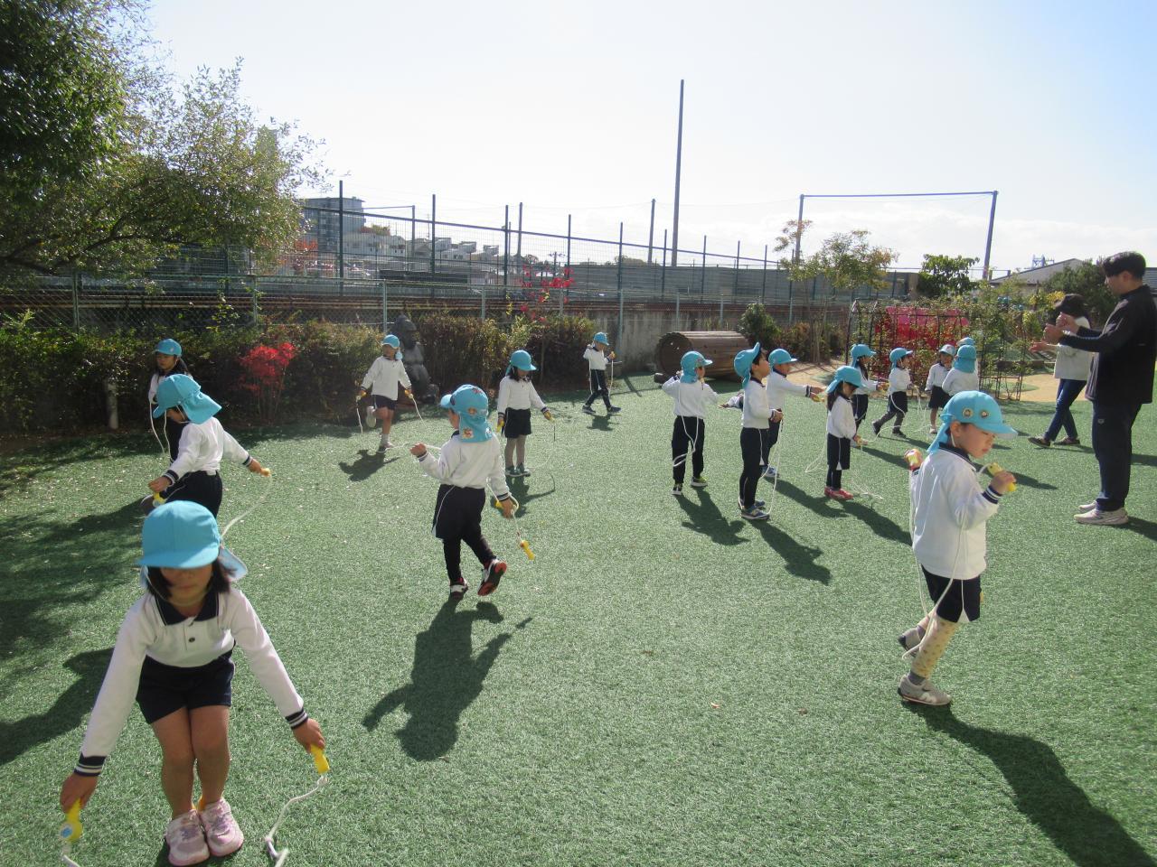 元気よく挨拶をした後、縄跳びを使って準備体操をしました。縄を踏まないようにジャンプをしたり、手首を使って縄を回したりして縄跳びの使い方を確認しながら取り組むことができています。その後、それぞれ自由に技の練習を行いました。「今日は7回跳ぶ!」「ケンケン跳びもやってみる!」と目標を立てながら一生懸命に取り組む子どもたち。難しくても諦めず、「どうやって跳ぶん?」「一回やり方見せて!」と友だちと確認し合ったり石元先生にアドバイスを貰ったりしながら何度も練習をする姿が見られました。