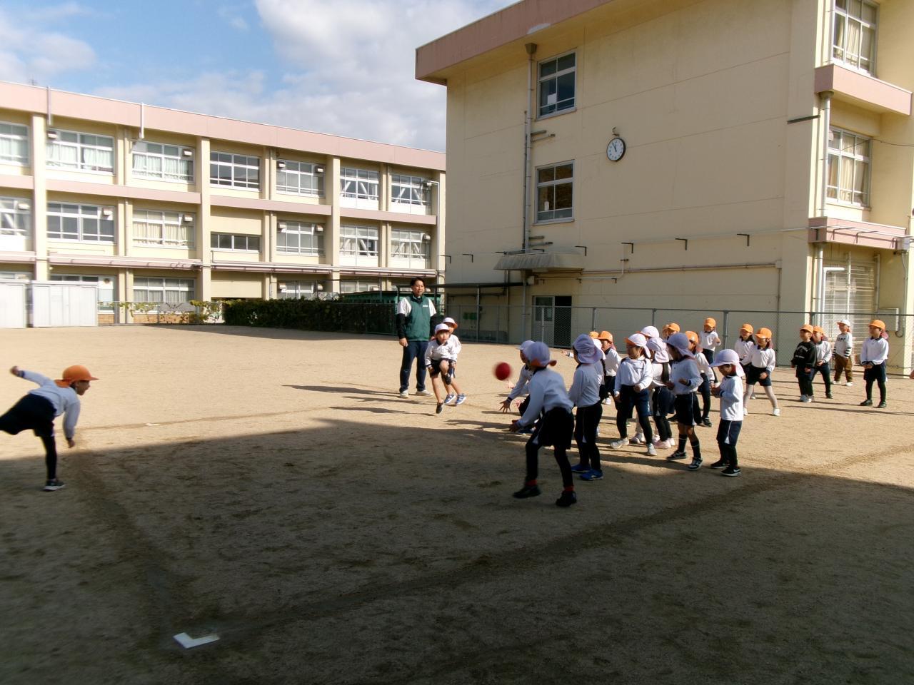 準備体操をした後、縄跳びチャンピオンに挑戦しました。前回と同じ前跳びで行い、子どもたちも「がんばるぞ」と気合十分で取り組んでいます。最後まで残っている友だちを「がんばれ」と自然に応援する姿も見られ、チャンピオンが決まった時には「すごい!」と拍手していました。その後、縄跳び表の練習に取り組み、「みてください!」「どうしたらいい?」と石元先生や保育教諭に積極的にアドバイスをもらったり、出来た技を見せたりと意欲的に行っています。最後は楽しみにしていたドッジボールを行いました。二チームに分かれて行い、どちらのチームもボールをキャッチした際にはすぐに投げることができています。「外野が多い時には外野にパスを回して当ててもらう」ことが大事なことを教えてもらい、「次もがんばろう」「勝つぞ」と期待を膨らませている子どもたちです。