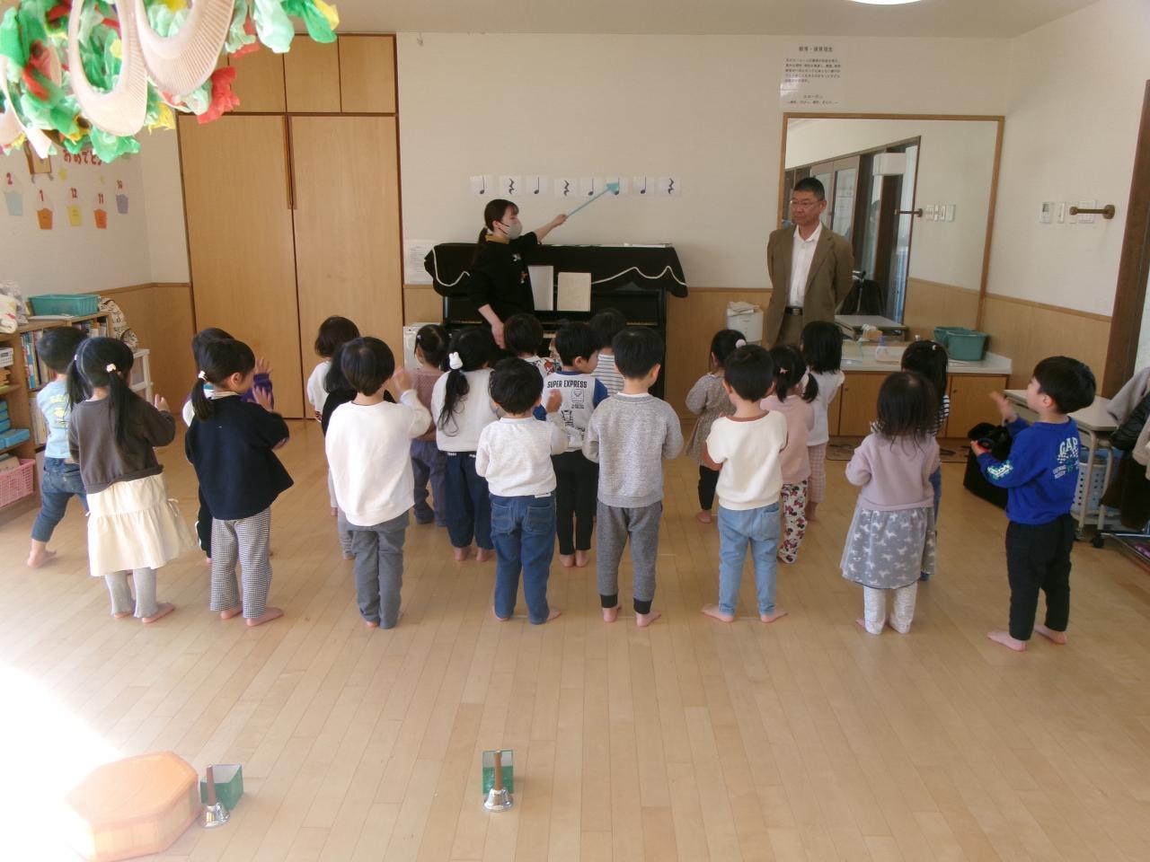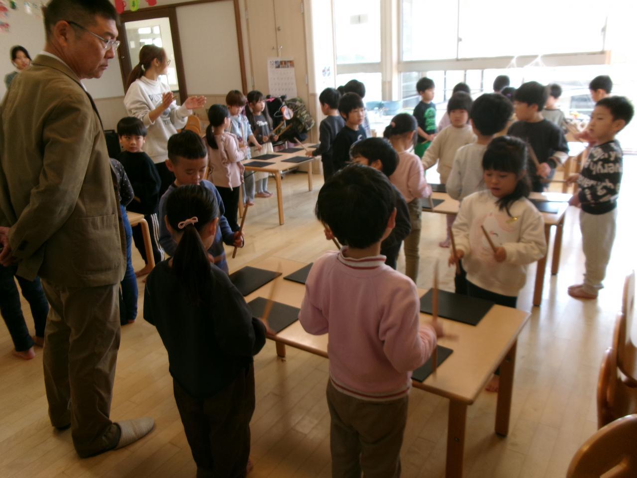 発声練習を行った後、季節の歌「サンタがまちにやってくる」「たきび」を聞いてもらいました。口を開けて歌うことを教えてもらい、意識して歌うことが出来ています。その後鍵盤ハーモニカをしました。基礎練習、曲練習を聞いてもらい、意識することを丁寧に教えてもらい集中して取り組む子どもたち。フレーズもつながるようになりきれいな音で演奏することが出来ています。最後にバチ練習をしました。 手首を使えるようになってきており、バチ打ちの際も軽くリズムを打つことが出来ています。リズム打ちの際は口ずさみながら行っており、上手に出来てきていることを内田先生に褒めてもらい嬉しそうにしている子どもたちです。新しいリズムも加わり意欲的に練習に取り組んでいます。