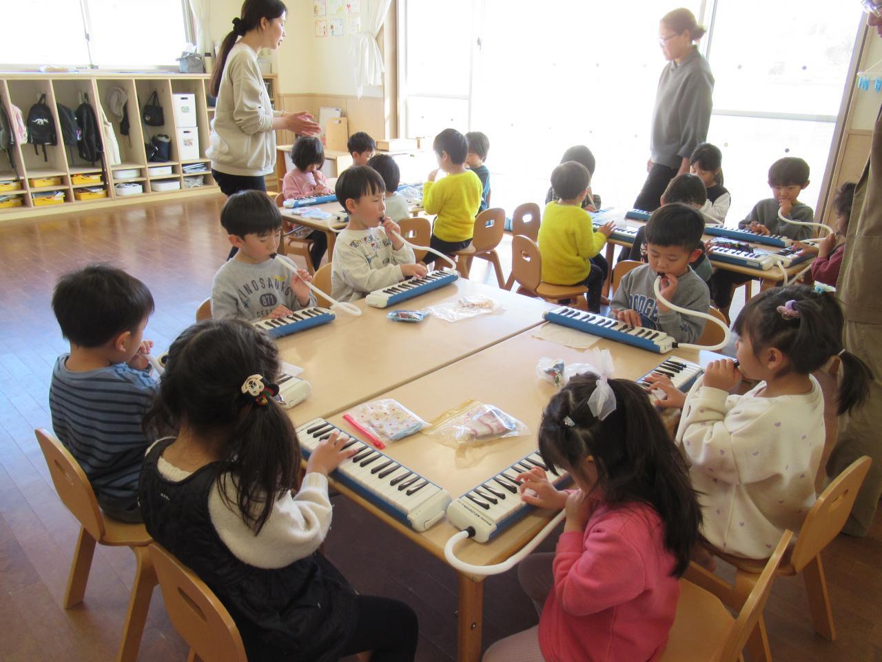 発声練習をした後、季節の歌をうたいました。『こぎつね』の歌では「コン コン」の歌詞を短く切って歌うことや、「やまのなか」のフレーズは「や」を大きく、「の」は力を抜いて歌うことを教えてもらい、意識しながら歌うことができています。また、『そうだったらいいのにな』の歌では「い」の口を、『赤鼻のトナカイ』の歌では「ん」の口を意識することでうまく力を抜くことができ、高音もきれいに発声することができています。鍵盤ハーモニカでは基礎練習をした後、曲練習に取り組みました。フレーズは繋げて演奏することを教えてもらい、フレーズをごとに練習することで最後まで繋げて演奏することができています。最後に『鉄腕アトム』の曲をパートごとに取り組み、前奏は小さく吹くことを教えてもらいました。