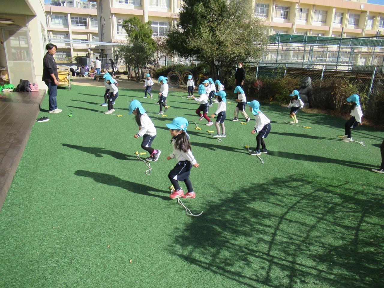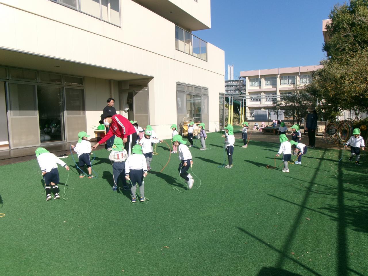 準備体操を元気に行い、縄跳びチャンピオンに挑戦しました。前跳びをどのくらい長く跳べるか挑戦し、一人ひとりが諦めずに取り組んでいます。チャンピオンが決まるまでみんなで応援し、楽しく挑戦しています。その後縄跳び表の練習に取り組み、自分の持っているシールの次の技は何かを確認し、練習しています。石元先生や保育教諭に何度も見てもらい、出来るようになるまで粘り強く練習している子どもたちです。シールが増えていくたびに目を輝かせ「もっと頑張るぞ!」と縄跳び練習に意欲的に取り組んでいます。最後はドッジボールをしました。「ボールをキャッチしたらすぐ投げる」を意識して行う子も増えてきましたが、ボールを投げるまでに時間をかけて投げる子もいました。石元先生にボールを投げる際には時間をかけると逃げるのを待つことになるため、すぐに投げるとお友だちを当てることが出来ることを丁寧に教えてもらい、次回に向けて気持ちを高めている子どもたちです。