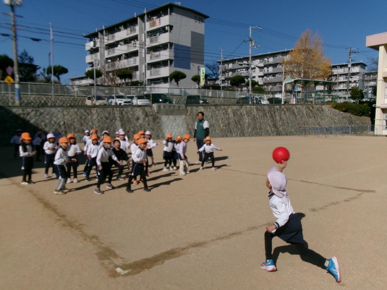 元気よく挨拶をし、準備体操をした後、縄跳びで線をつくってジャンプの練習をしました。連続で跳ぶことができる子が増え、「5かいもできたで!」「せんせいかぞえて~!」と意欲的に取り組む子どもたちです。縄を持って前後にまわす練習では、「1・2・3…」と数えながら腕を動かして上手に縄をまわしています。縄跳びの後は中当てをしました。ボールに当たらないように走って逃げたり、ジャンプをしたりして楽しく体を動かしています。