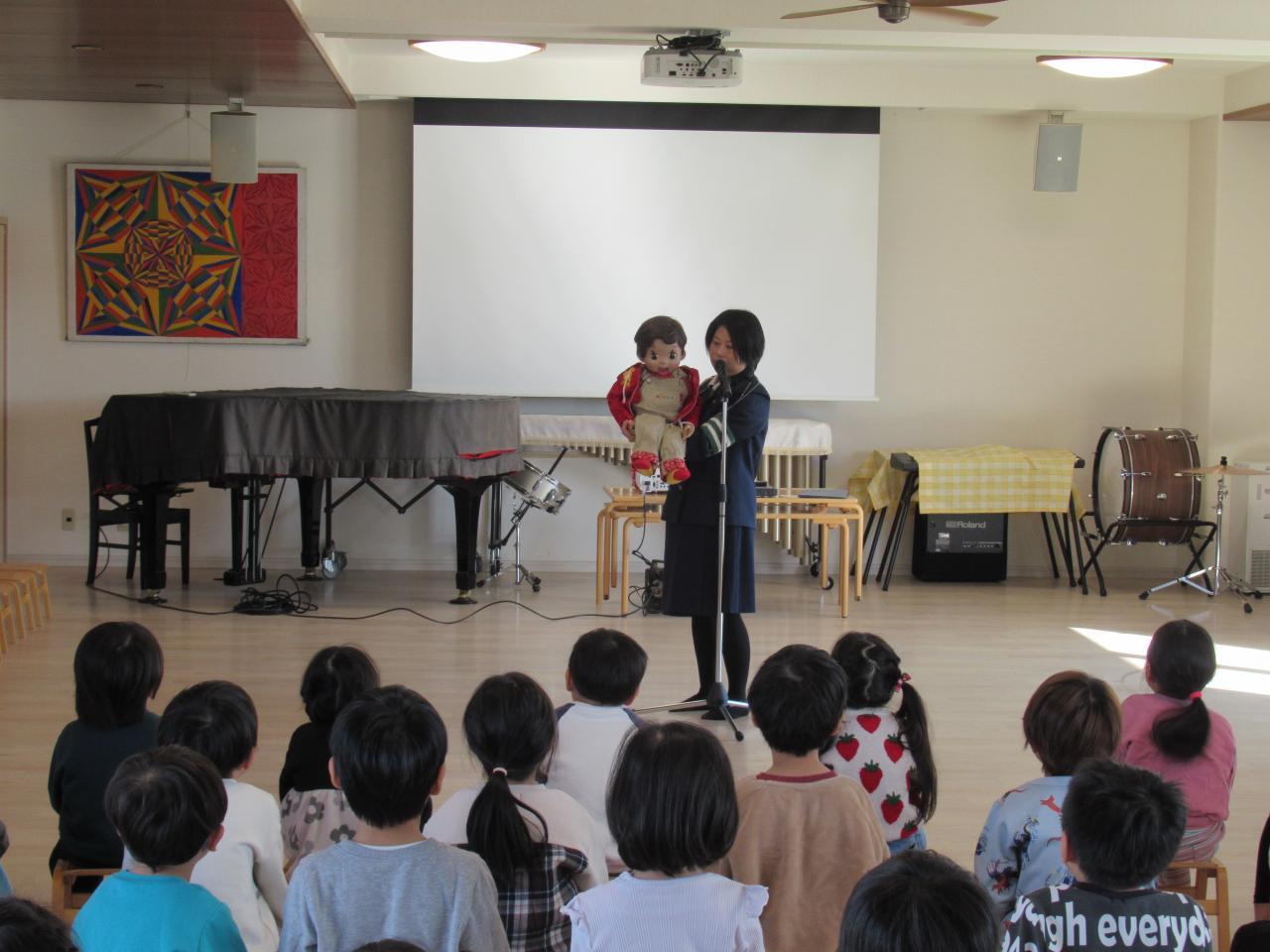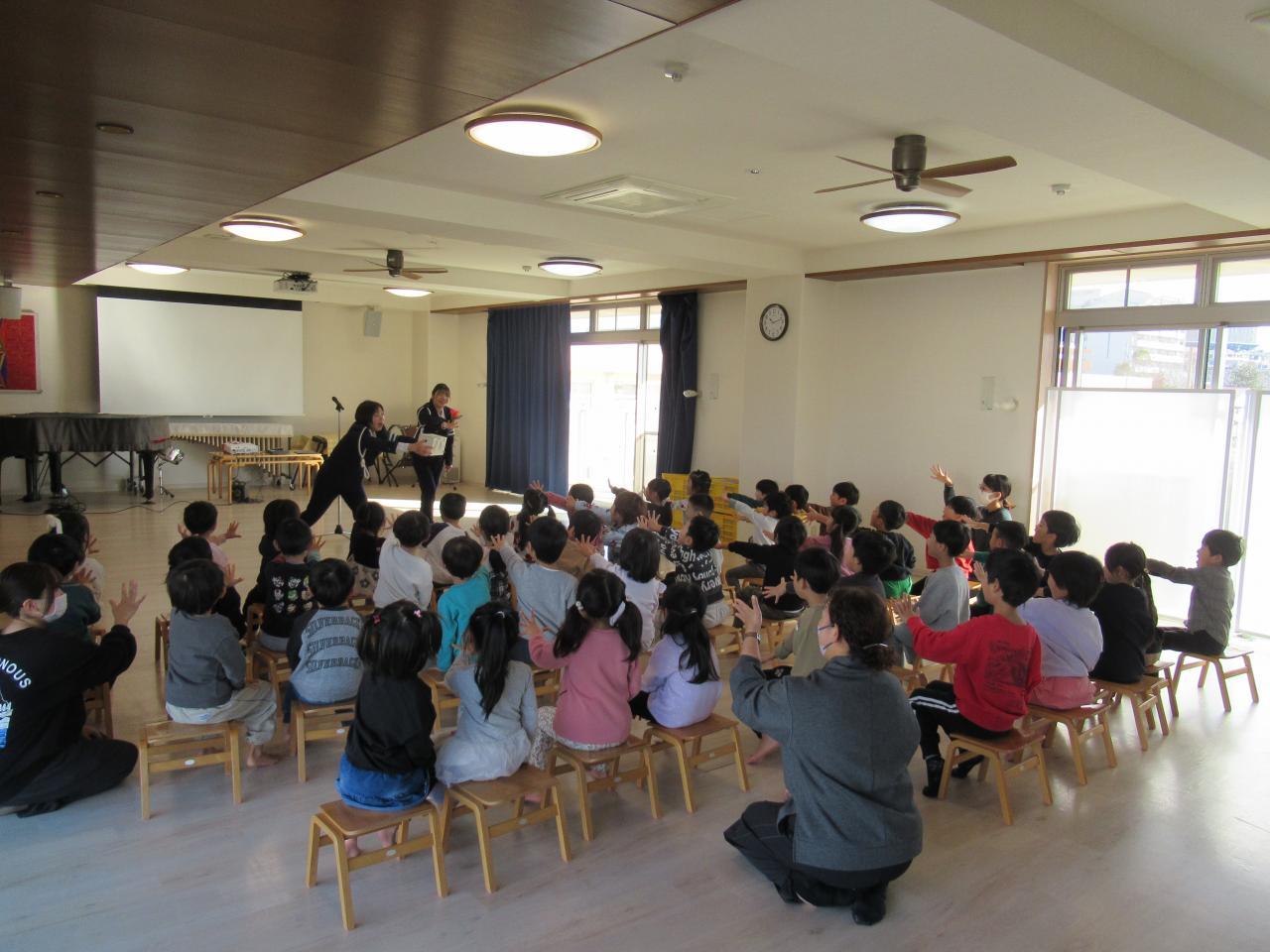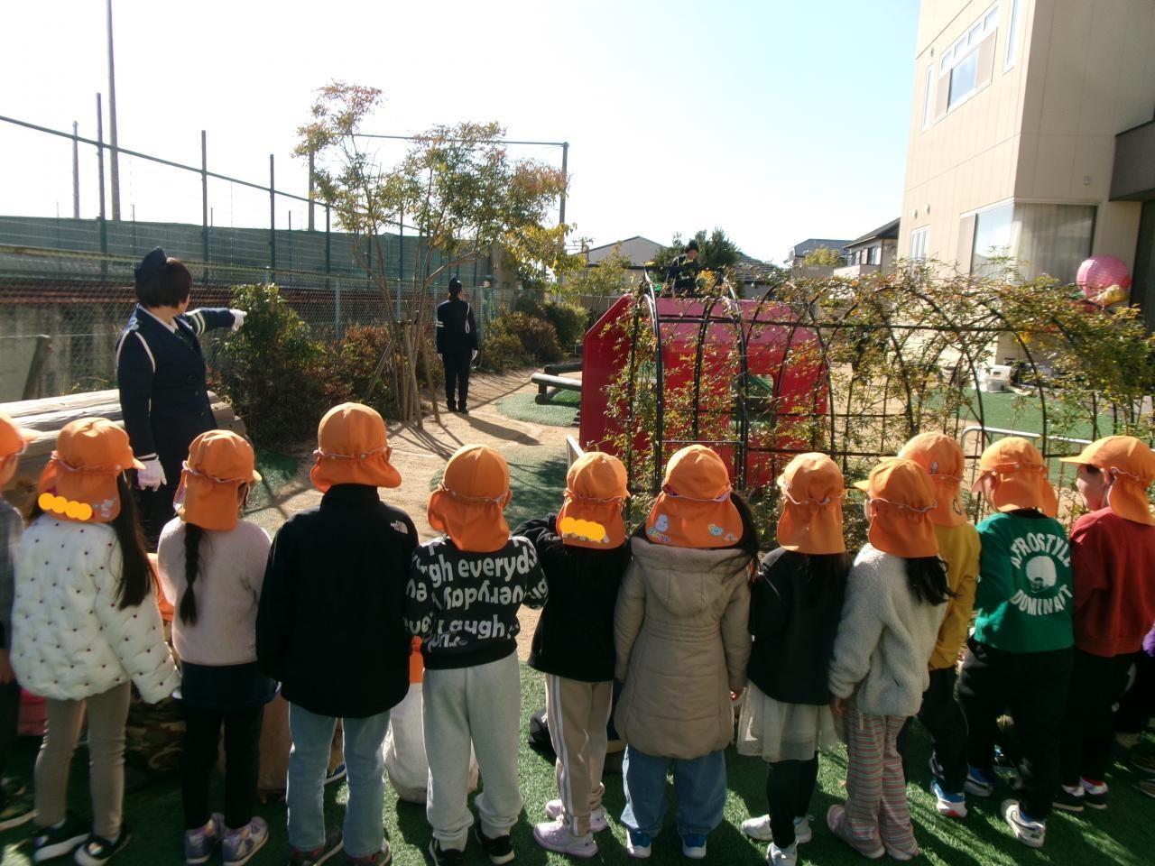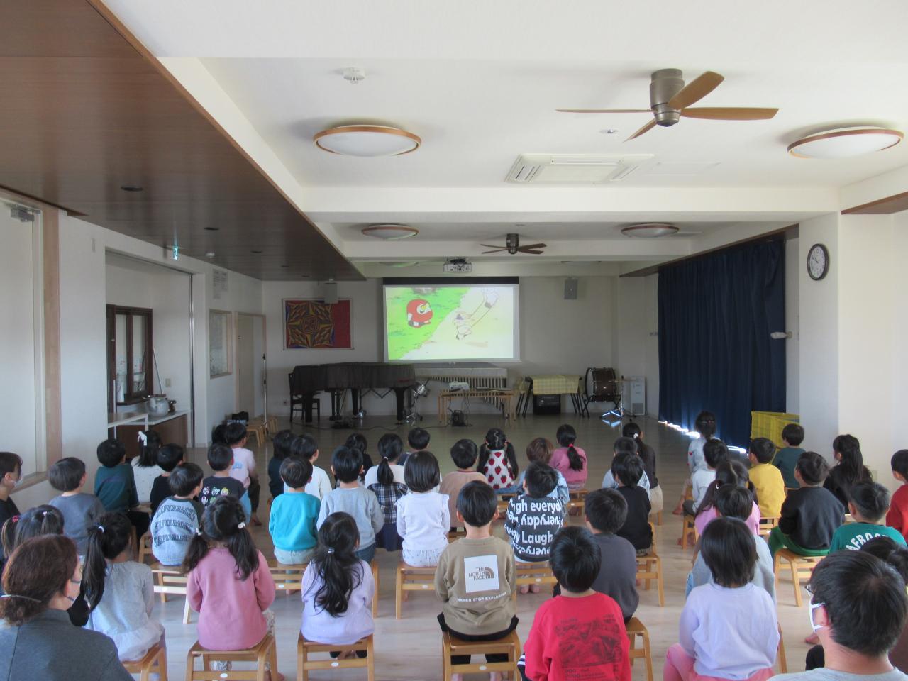 垂水警察署の警察官の方に来ていただき、交通安全の話をしてもらいました。最初に、魔法の箱におまじないをかけ、出てきた青色、黄色、赤色の布で信号の意味を確認しました。青色では「止まる」「右左右を確認する」「手を挙げる」の3つの約束事があることを教えてもらい、警察官の方と一緒に一連の流れを練習しました。その後、人形のけんちゃんと一緒に信号のない横断歩道の渡り方を確認しました。知っていることや教えてもらったことを思い出しながら積極的に発言し、意欲を持って参加する子どもたちです。最後に、DVDを見ました。キャラクターたちが様々な場面での道路の渡り方を教えてくれ、交通ルールを守る大切さを学ぶことができました。