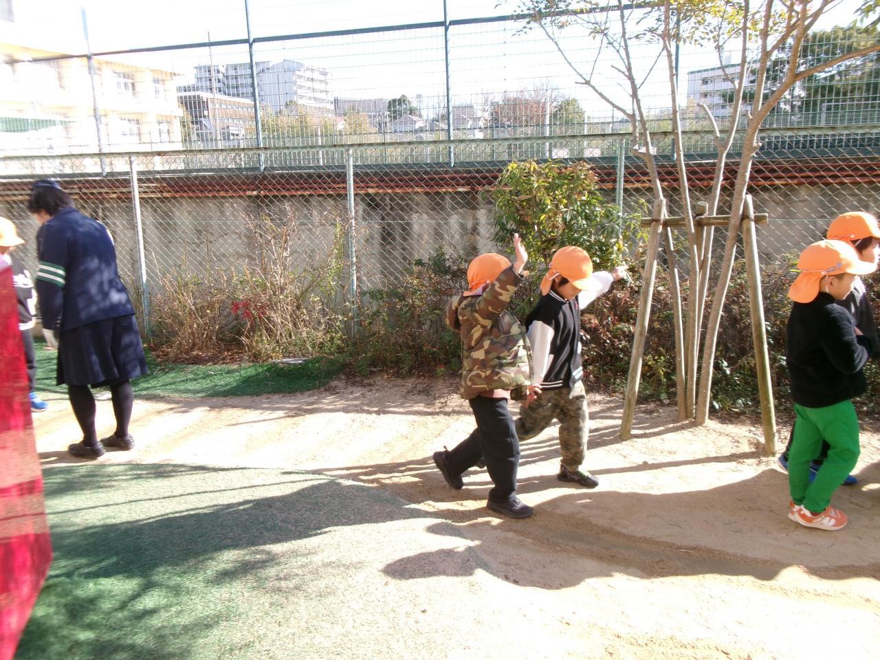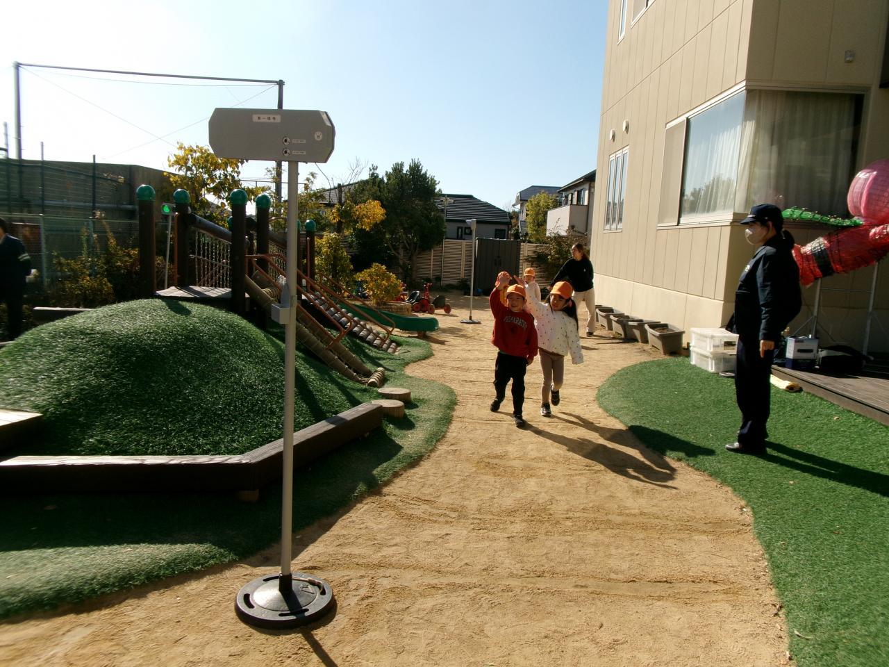 歩行訓練では、警察官の方から聞いた話やDVDで教えてもらったことを思い出しながら実際に園庭で信号機をよく見ながら友だちと一緒に渡りました。横断歩道を渡っている時に信号機が光ったら、最後まで渡りきるか戻るか自分で考えて行動しています。また、渡る前には一度、立ち止まって左右を確認してからまっすぐ手を挙げてから自動車などが来ていないのを確認して渡ることができており、一つひとつの交通ルールを理解し意識しています。