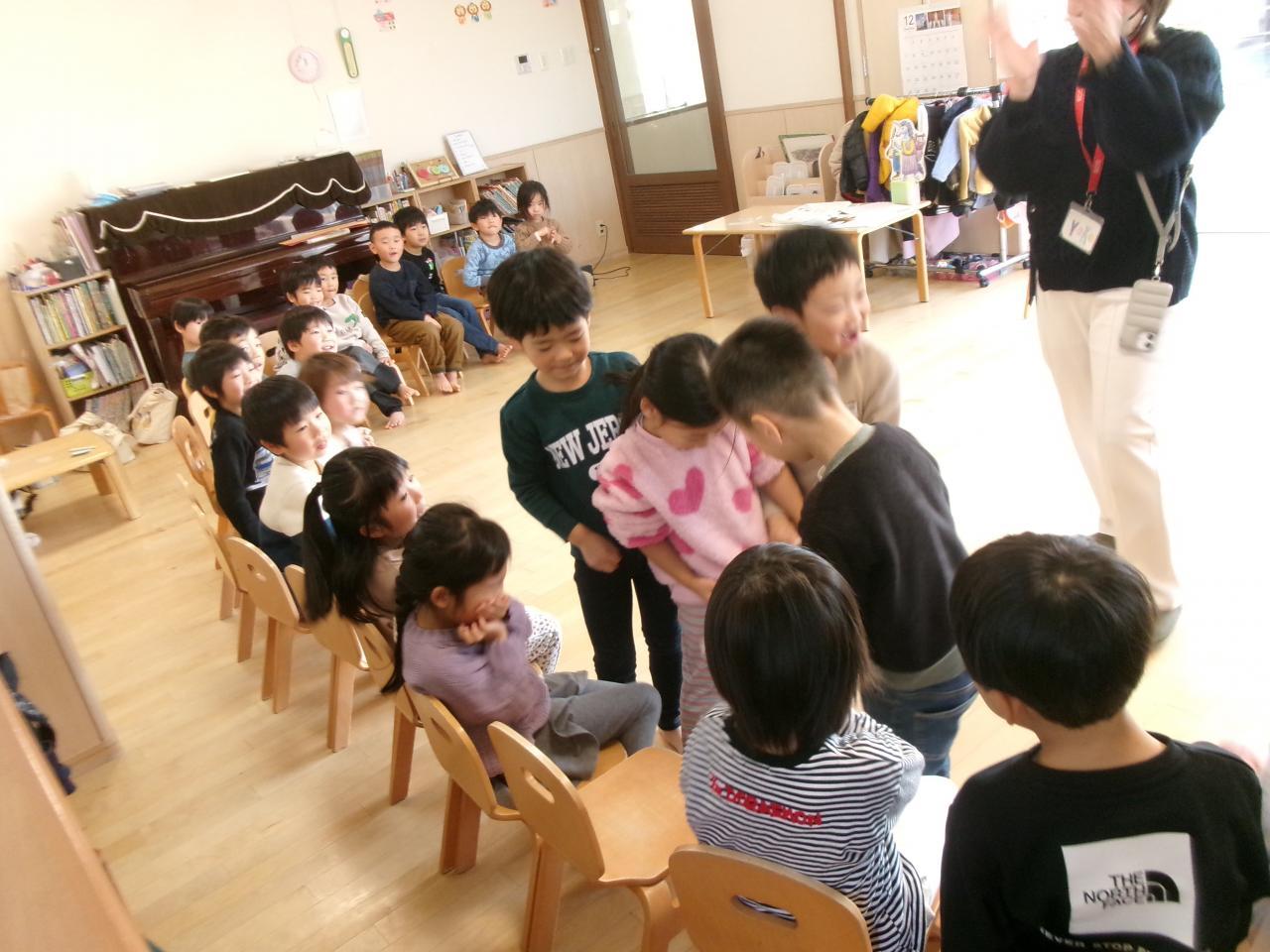 天気や四季の確認をした後、新しい単語「December(12月)」「winter(冬)」「sweater(セーター)」を教えてもらいました。英語の先生の真似をしながら上手に発音することができています。エクササイズでは、「touch the floor」「shake your body」などの指示をよく聞いて、元気いっぱいに体を動かしながら取り組む子どもたちです。その後、カードを見て虫の名前を答えるクイズをしました。前回教えてもらったことを思い出しながら「It's a ○○!」と答えることができています。また、新しく動物の「panda(パンダ)」「koala(コアラ)」「camel(ラクダ)」「polar bear(シロクマ)」「kangaroo(カンガルー)」を教えてもらい、みんなで発音した後はグループに分かれて動物のカードを探すゲームをしました。グループで話し合いながら1つずつカードをめくり、見つけた時には「あった!」「正解や!」と嬉しそうにする姿が見られました。