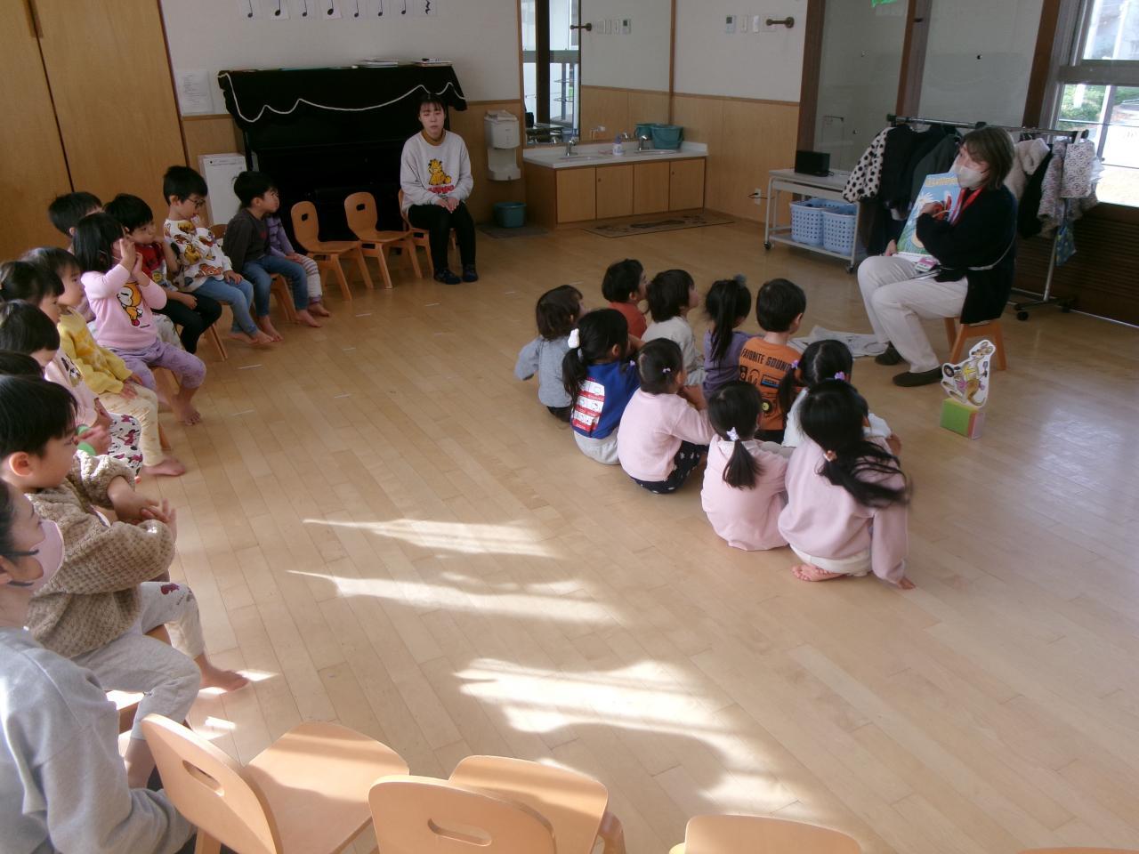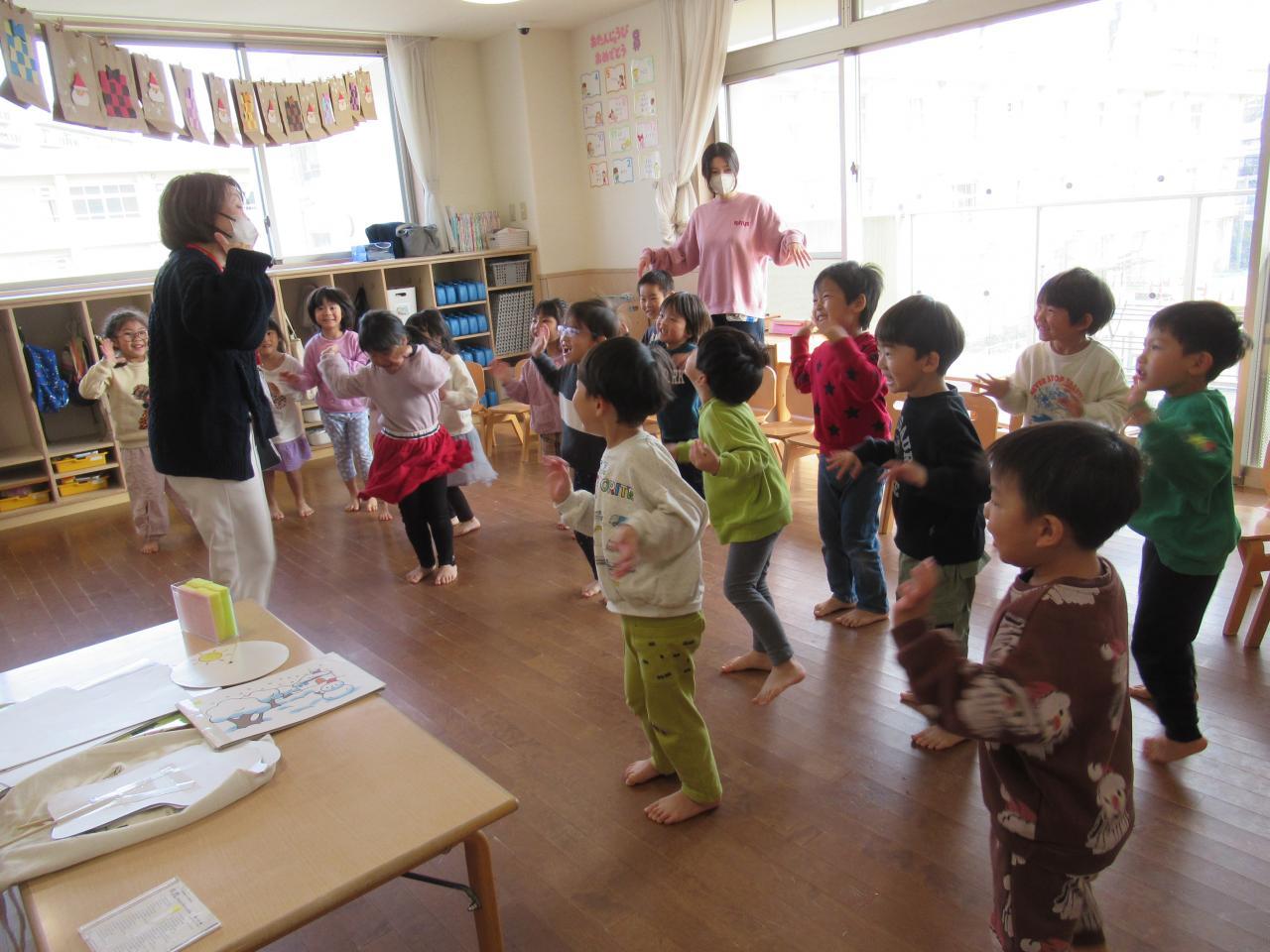 英語の先生に元気よく挨拶し、天気や季節の確認をした後、「December(12月)」と「sweater(セーター)」の発音をイラストを見ながら楽しみました。体を動かすエクササイズでは、「Shake the body」と英語の先生に言われると、足や手など体の部位を笑顔で揺らしています。絵本『Letter for you』では、テントウムシが様々な虫に手紙を届ける姿を見て、「アリに手紙渡している!」「クモから手紙もらえた!」と近くの友だちとやり取りしながら楽しんでいます。最後に、「ant(蟻)」「bee(蜂)」「butterfly(蝶)」「ladybug(テントウムシ)」の4つの虫の発音を、3人の友だちが蟻のカードはどこにあるか探す様子を見ながら、みんなで一緒に笑顔で取り組んでいます。