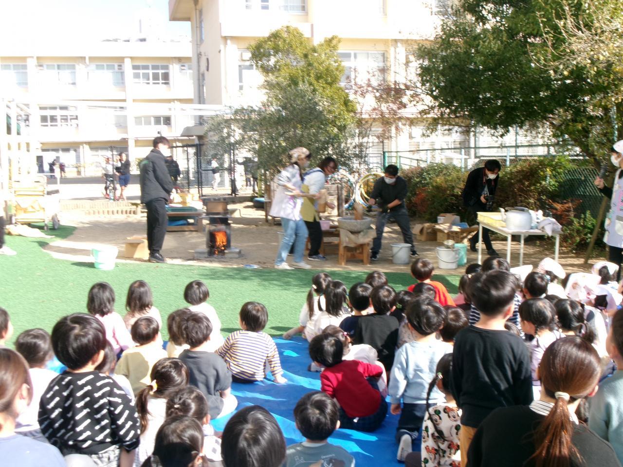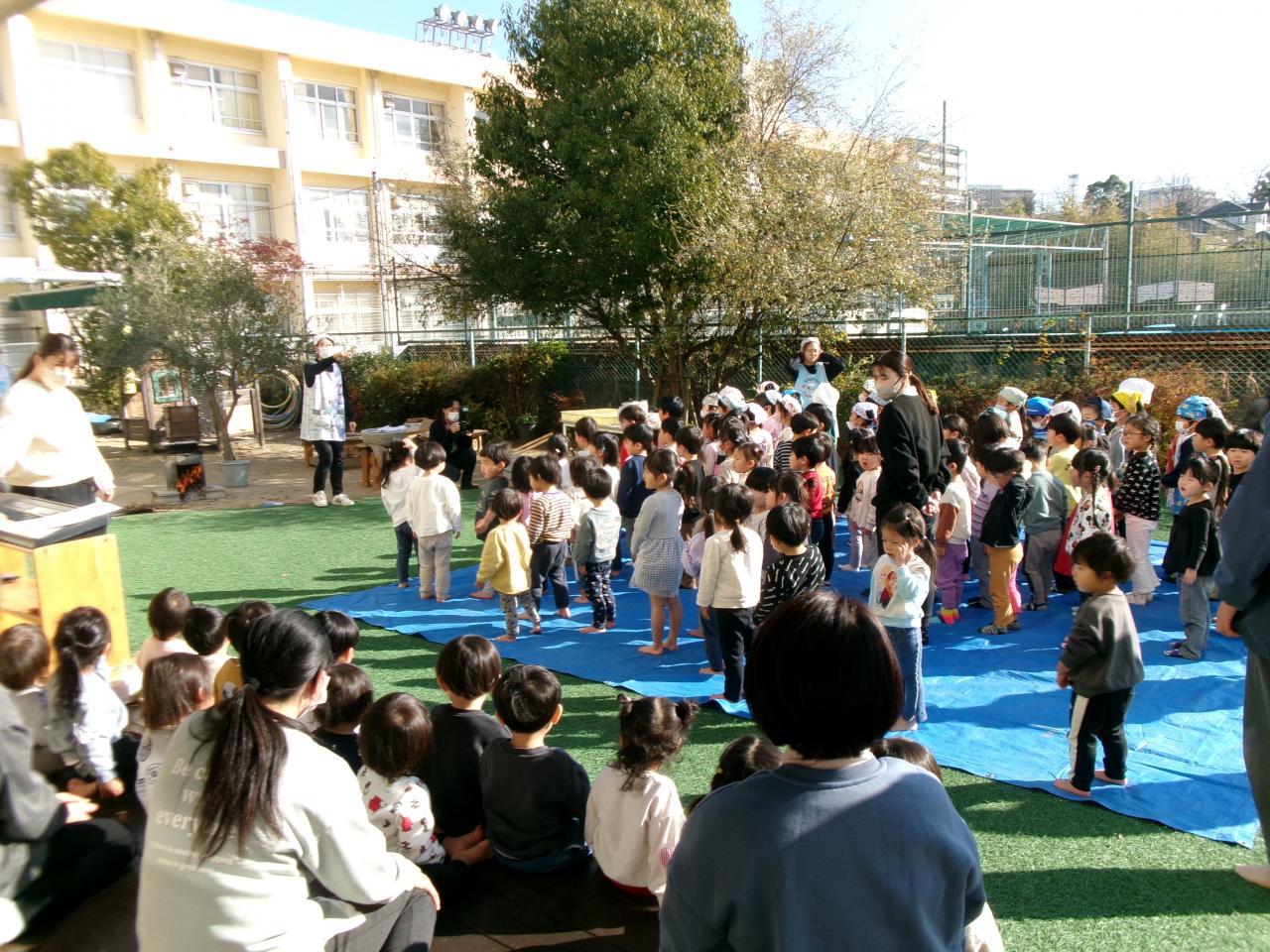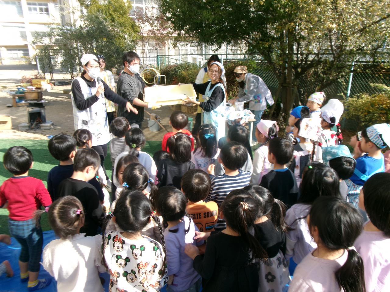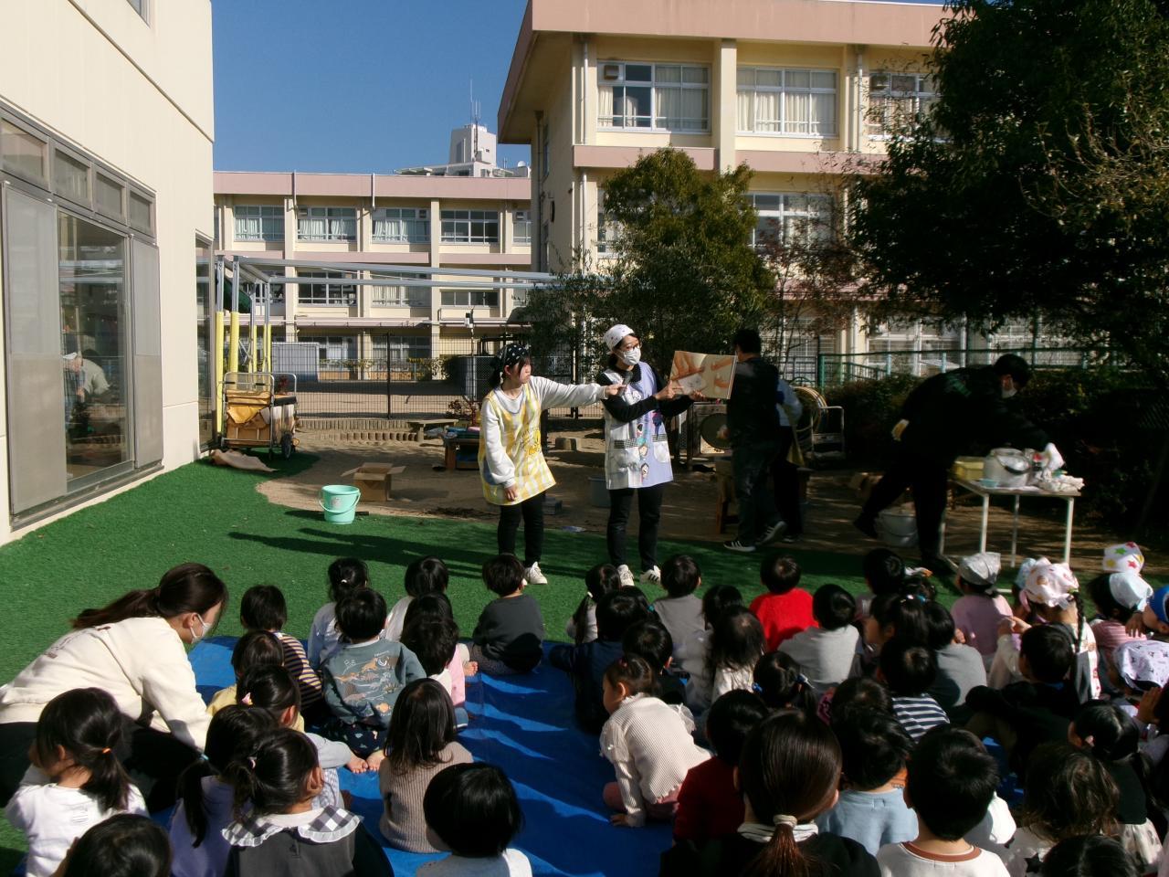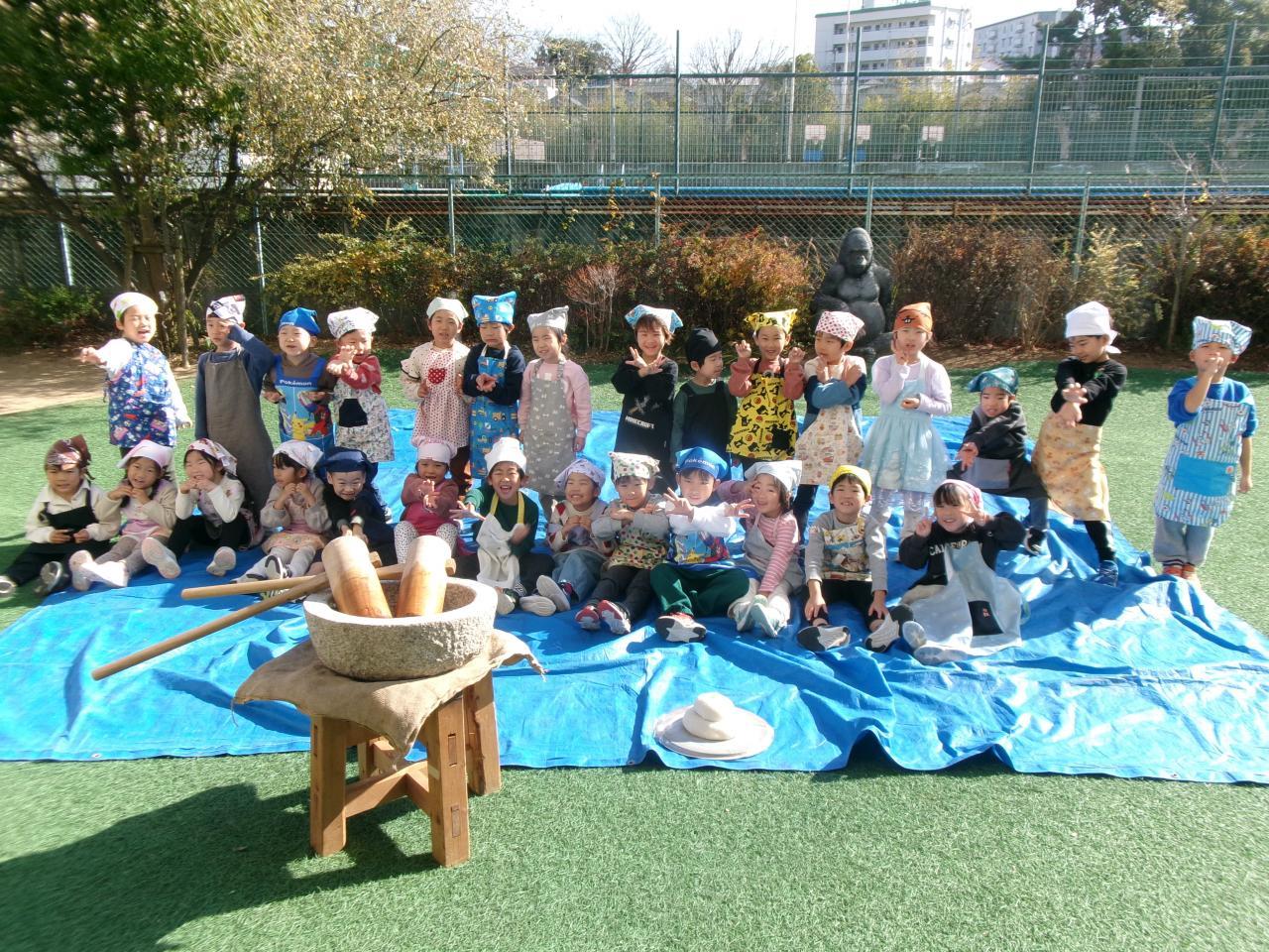 もちつきに参加しました。子どもたちは朝から「今日、もちつきの日!!」「おもちできるかな~」と会話を弾ませています。みんなでもちつきの歌をうたったり、もちつきの時に使う道具の名前を教えてもらいました。また、「おもちのきもち」の絵本を見て、のしもちと鏡餅の形を知りました。保育教諭がついている様子を見て子どもたちも一緒に「よいしょー」と言って元気よく掛け声をかけています。らいおん組の友だちは、エプロン、三角巾、マスクをつけて一人ずつもちつきを行いました。杵を持つときに重そうにしている子もいましたが、保育教諭と一緒に楽しんで取り組みました。又、出来上がったお餅を見て「おいしそう」「はやくたべたい!!」と言ったり、お餅を手で触って自分の思ったことを友だち同士で伝え合っています。