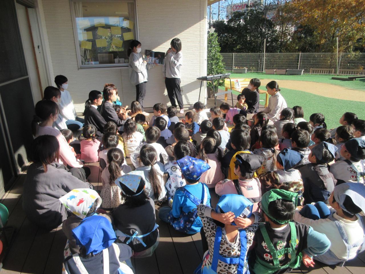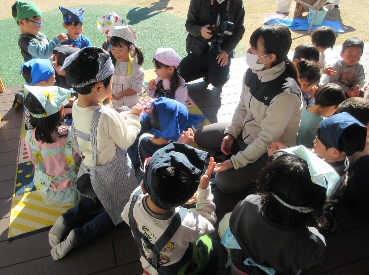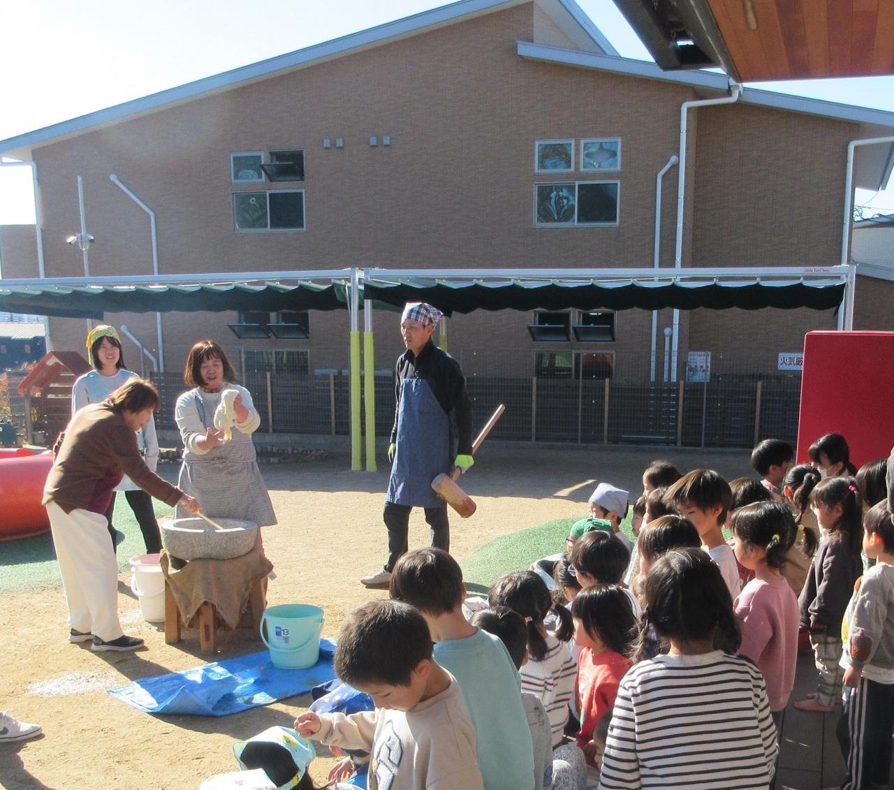 今日はもちつきに参加しました。まずはもちつきの歌をうたいました。「もちつきぺったんこ~」とみんなで元気よく声を出して楽しんでうたっています。また、絵本「おつきさんでおもちつき」では様々な生き物がおもちをついている姿に子どもたちは興味津々で見ています。他にも道具の名前を実際に見ながら学んだり、もち米を見たりしました。ぶどう組は杵でおもちをつきました。「重い!」「できるかな?」と言いながら自分の力でつくことができています。自分たちでついたおもちを手で触りました。伸ばしたりちぎったり「気持ちいいなあ」と言いながら感触を楽しみました。