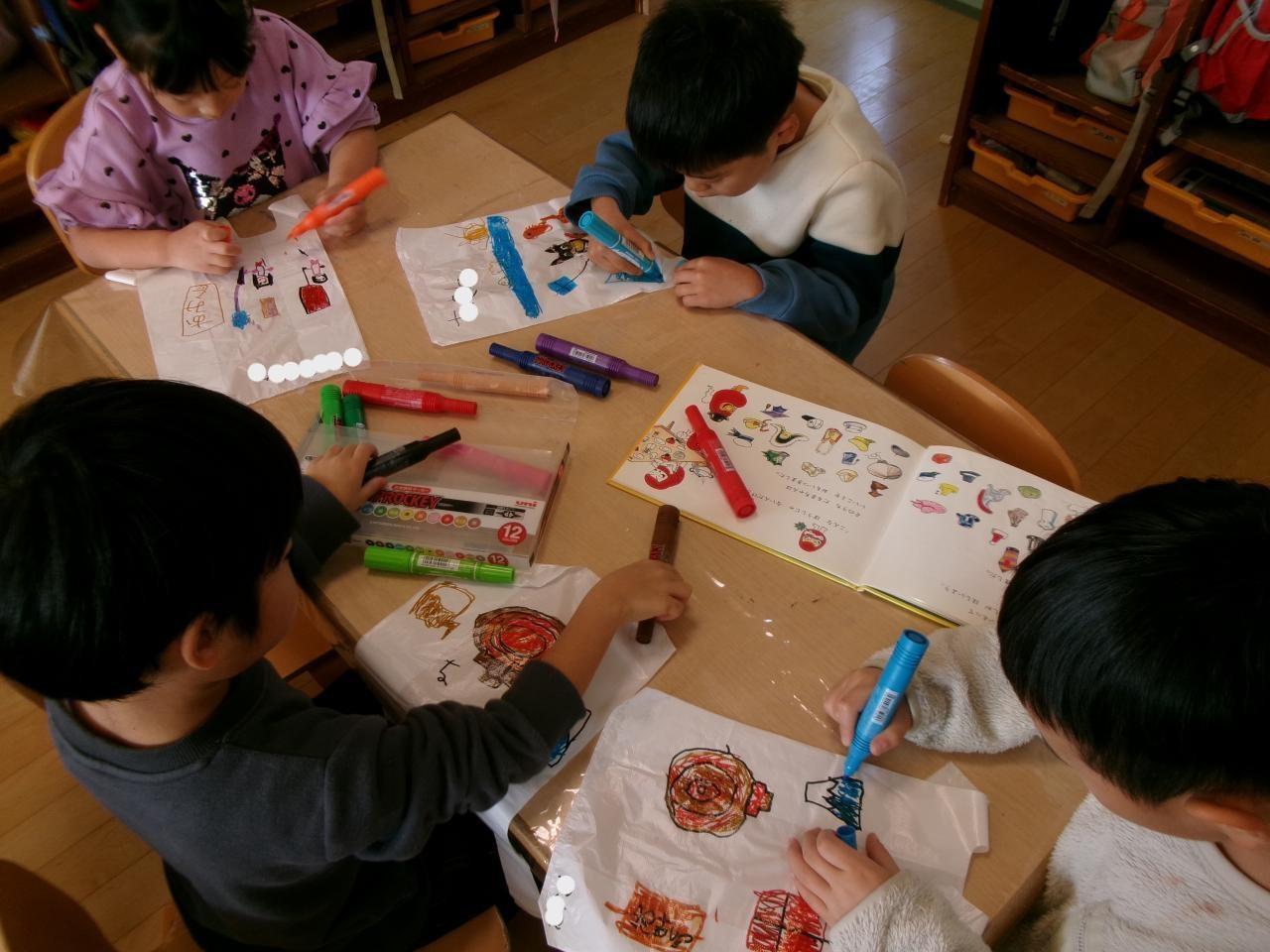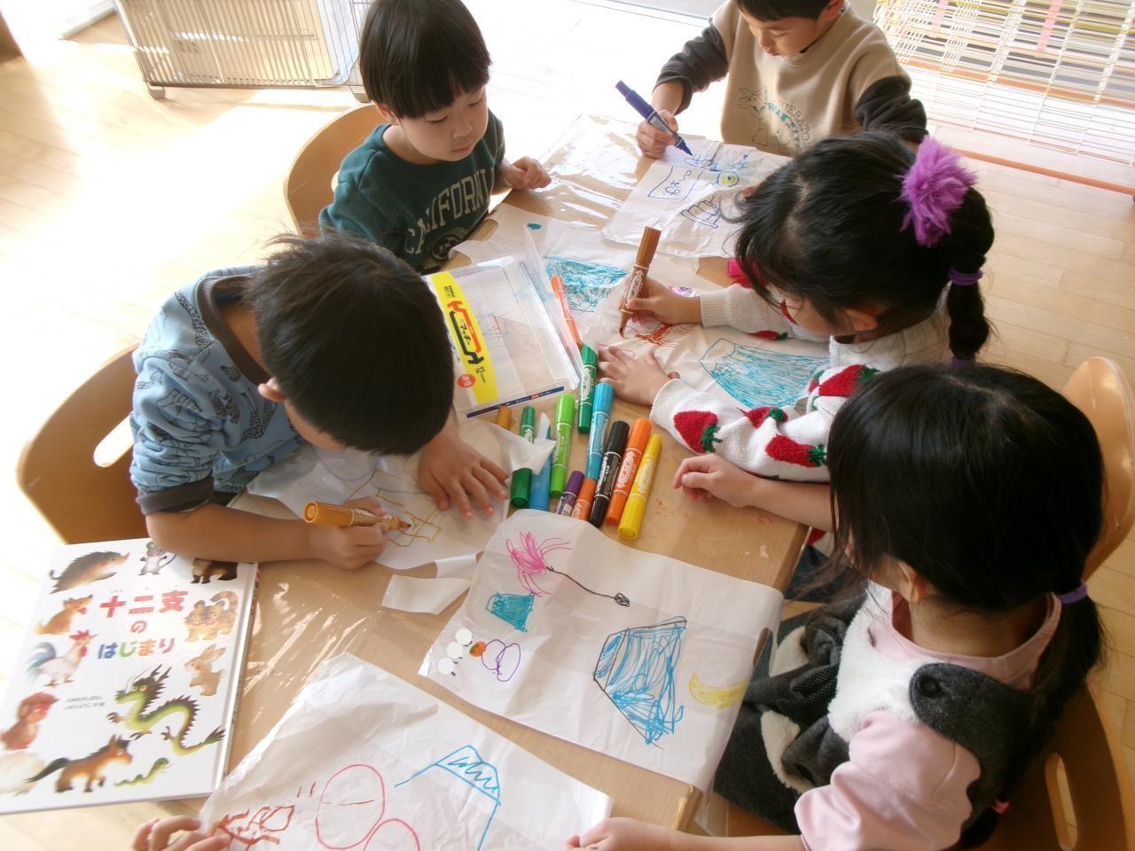 「あけましておめでとうございます」とお友だちや保育教諭に新年の挨拶を進んでしている子どもたち。「ひさしぶり!」と嬉しそうにお友だちと話をしています。年末年始のお休みに何をしたか、何が楽しかったか一人ずつ発表して「凧揚げしたよ!」「旅行いってきたよ」「おじいちゃんおばあちゃんの家に行ってきたよ」と話しています。その後、正月の伝承遊びについて話を行い、凧製作をしました。「お正月といえば何があるかな」と聞くと「鏡餅!」「凧揚げ」「だるま」「門松」「今年はうまどし」とそれぞれが思いついたお正月を話しています。自分の凧に好きなお正月の絵を描く際には、「門松ってどうだったけ?」「見て!だるま描いたよ」「富士山描いた」「初日の出描いてもいい?」とお友だちと話したり、絵本を見ながら描いたりとイメージしたものを様々な色を使って楽しそうに描いていました。