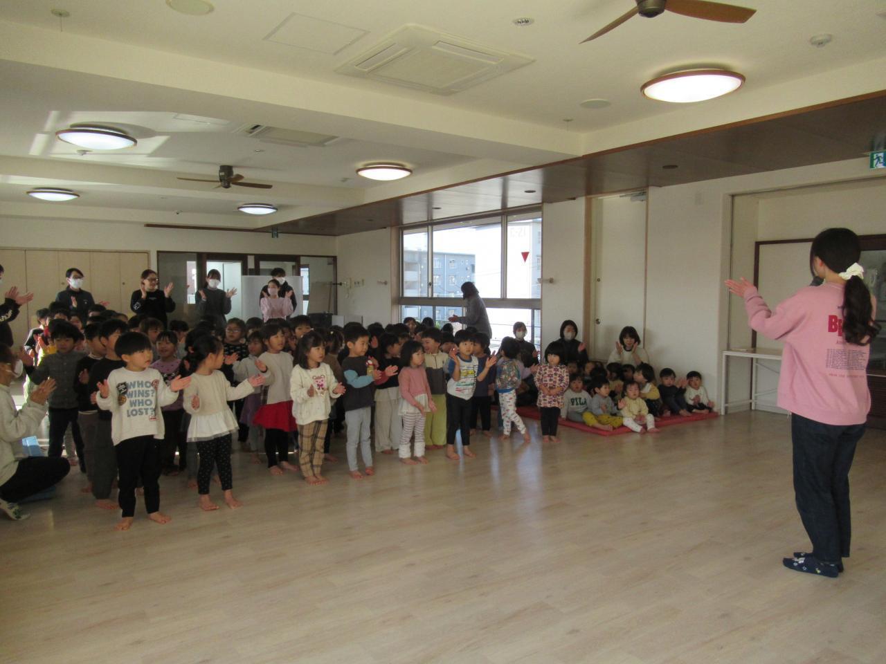 みんなで「あけましておめでとうございます」と新年の挨拶をした後は、お正月にしたことやお手伝いしたことを元気いっぱい手を挙げて発表している子どもたちです。「お年玉もらった」「おせち食べた」「洗濯物畳んだ」「草引きした」などと楽しい話をたくさん聞かせてくれました。