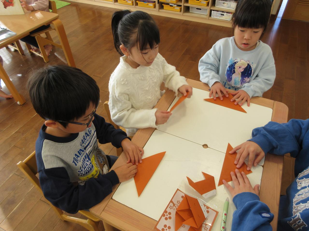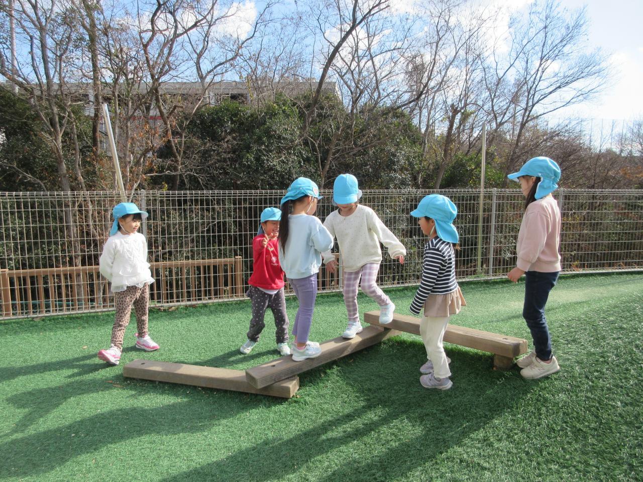 ワークでひらがなの「て、り、の、め」を書く練習をしました。まずはお手本を指でなぞり、書き順やとめる、はねる、はらうところを確認します。マスの中にきれいに書けるよう大きさに気を付けながら、お手本をしっかり見て鉛筆で書きました。また折り紙で馬を折り、色鉛筆で好きな顔を描きました。戸外ではじゃんけんを使ったゲームをしました。2チームに分かれて平均台の上を進み、向かい合ったところでじゃんけんをして勝ったら進むことができ、負けたら降りて次の人が進みます。あいこが続くと期待が高まり、とても盛り上がりました。みんなで応援して楽しみました。