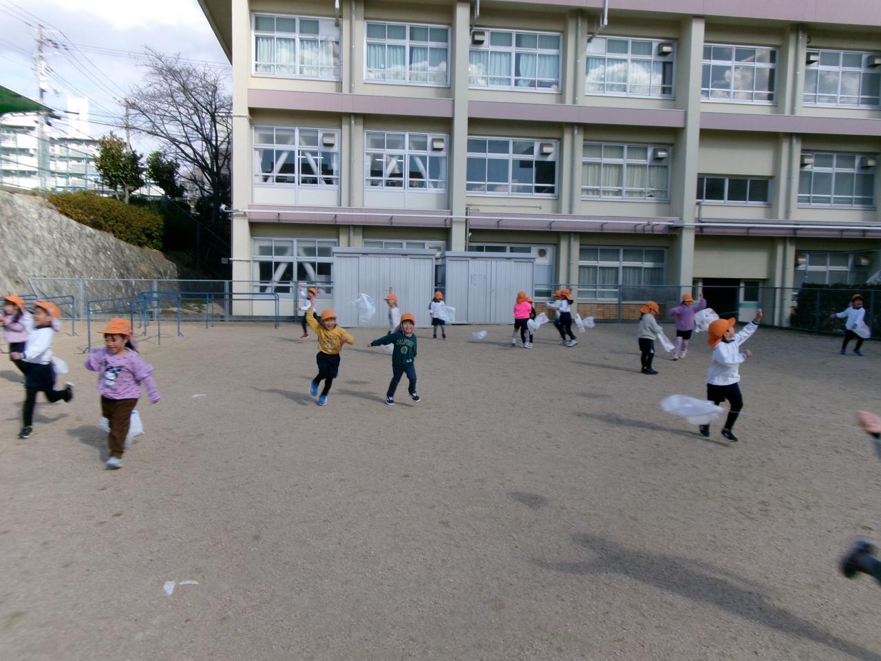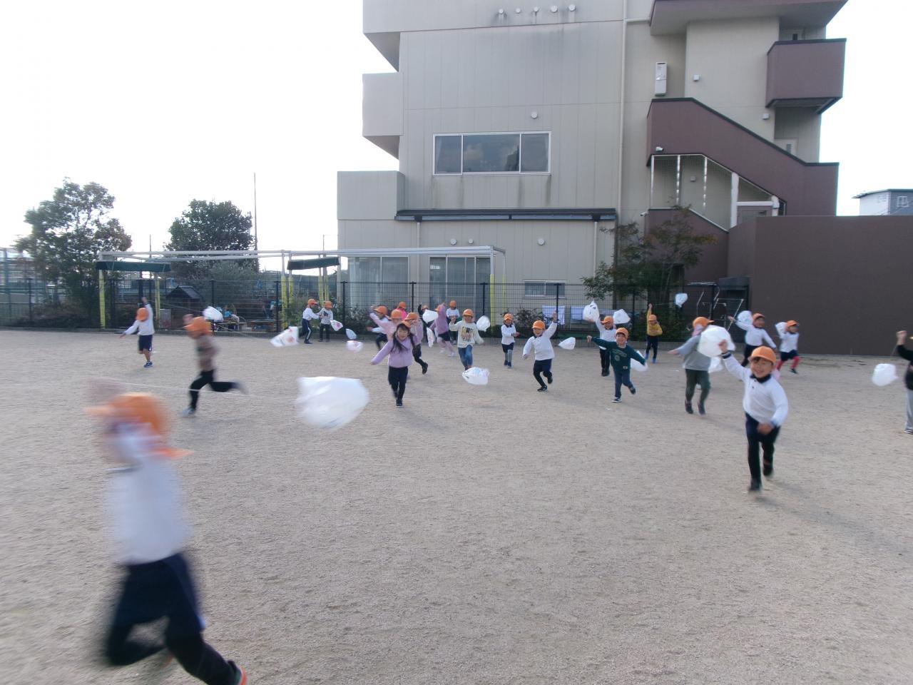 第二グラウンドで凧揚げをしました。朝から「今日凧揚げだよね?」と凧揚げを心待ちにしていた子どもたちは、保育教諭から自分の凧をもらい嬉しそうにしています。初めに一列に並んで凧揚げを行い、その後は好きな所を走りながら凧揚げをしました。「よーいスタート」の合図でお友だちと一緒に凧揚げをする子や、凧を高くあげるために思い切り走る子などそれぞれ楽しみながら凧揚げを行いました。その後、園庭でコマ遊びやドッジボールを行い、コマ遊びでは少しずつコツを掴んできており、回るようになってきており正月遊びに親しんでいます。