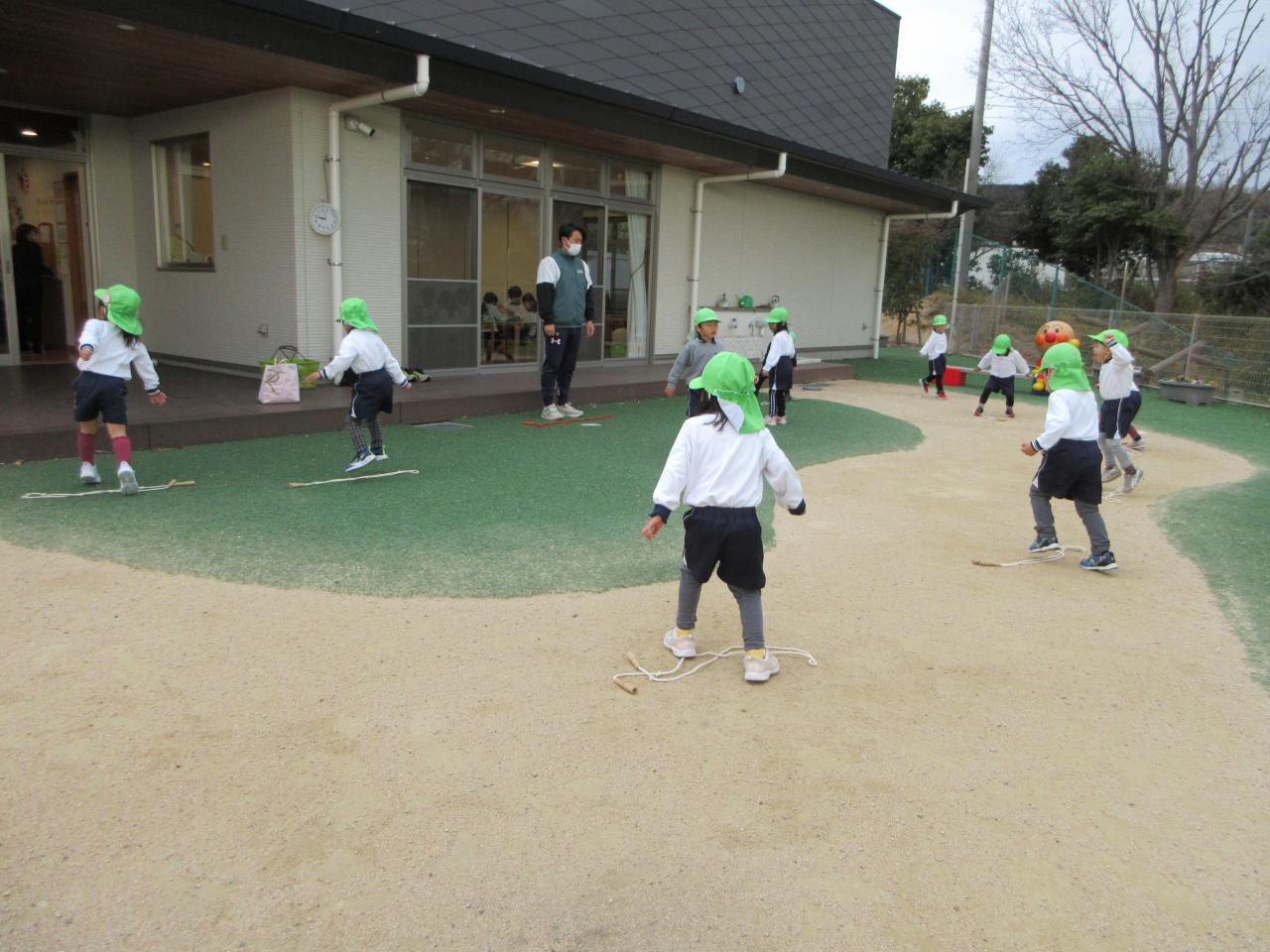 縄跳びをしました。準備運動では、縄を下に置いてジャンプで越えたりケンケンをしたりしました。また、それぞれの技に取り組みました。「次はケンケンとび5回!」と目標に向かって一生懸命練習をしています。何度も挑戦をしてどんどんできる技が増えてきています。