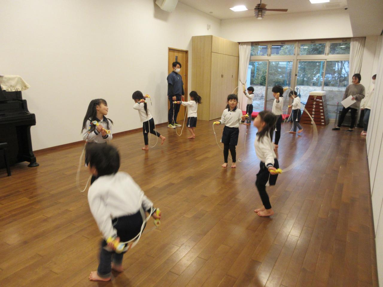 室内で縄跳びをしました。久しぶりの体育指導に子どもたちはワクワクしています。まずは縄を床に置いてジャンプをしたり、回す練習をしたりしました。また、各自で技に取り組み、引っかかっても何度も諦めずに跳んでいます。技ができると嬉しそうに友だちや保育教諭に教えています。