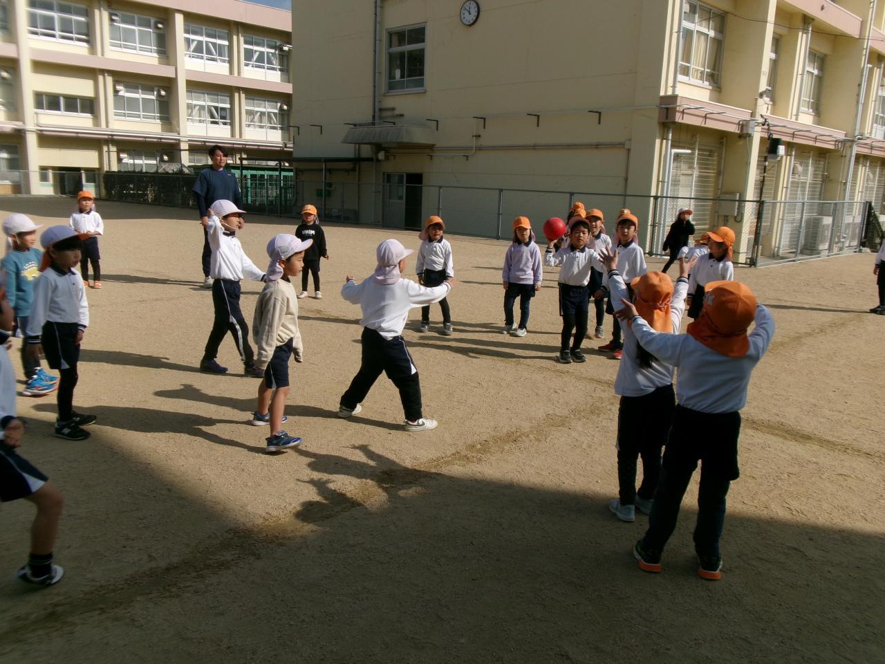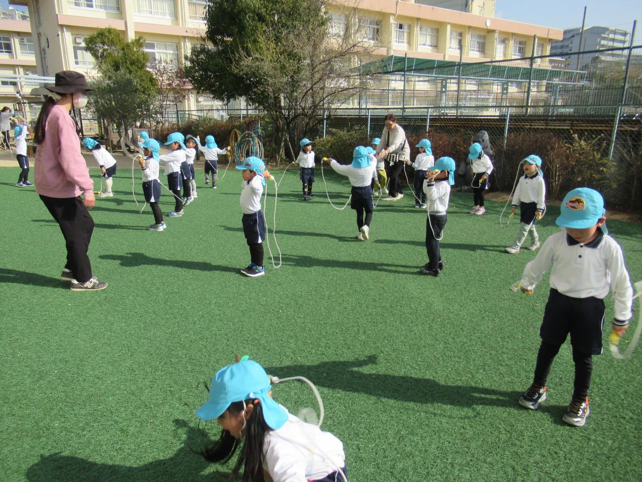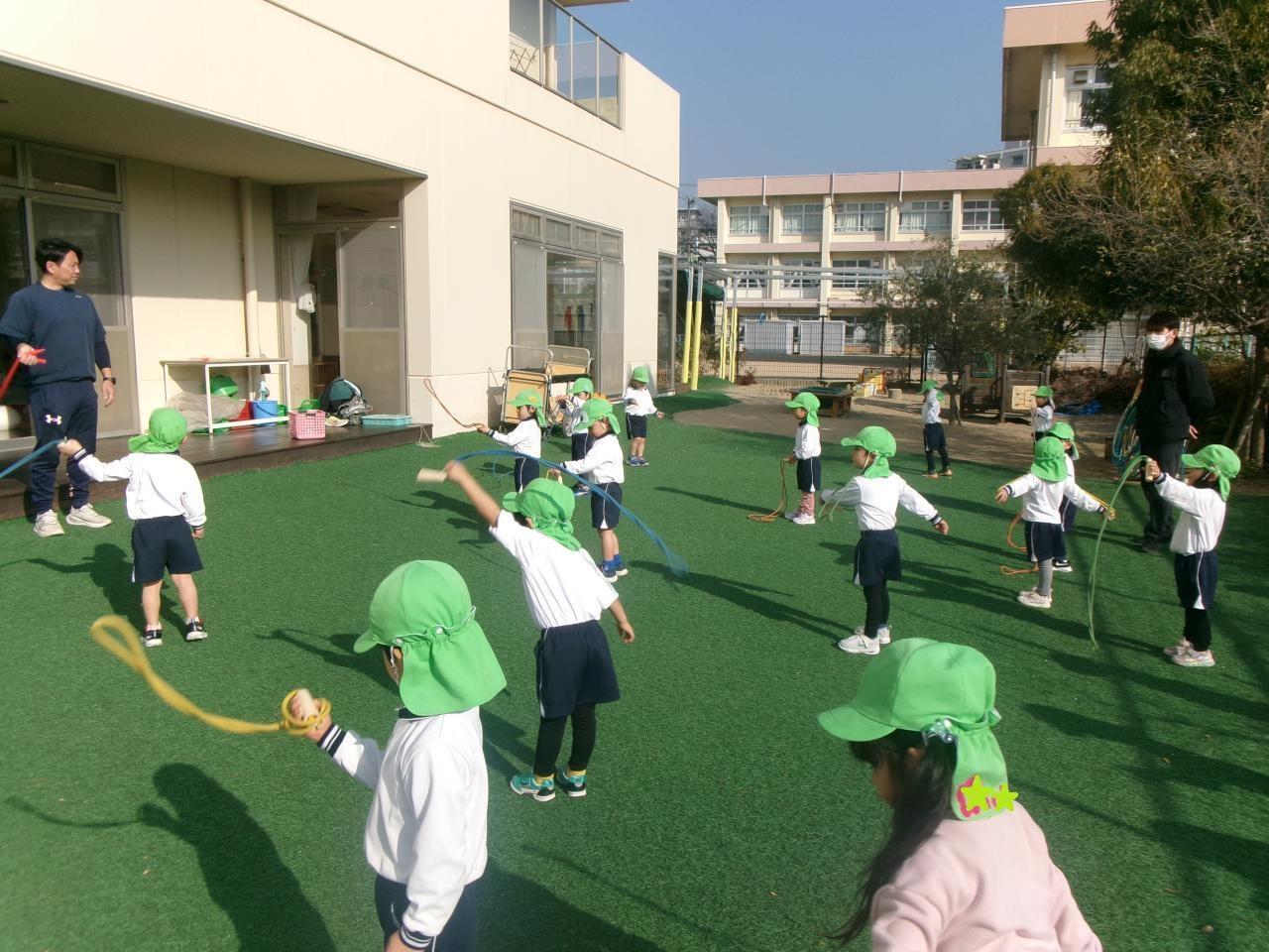 準備体操をして跳び方や縄の回し方を確認した後、縄跳び表の練習に取り組みました。連続跳びの練習をしたり、新しい技に挑戦したりして意欲的に取り組む子どもたち。何度も練習を重ね、跳ぶことが出来た時には「先生見とって!」「○回連続で跳べたで!」と嬉しそうに友だちや保育教諭に知らせる姿が見られました。また、「がんばれ!」と友だちの応援をしたり、回数を一緒に数えたりして楽しみながら取り組んでいます。その後、中当てをしました。ボールに当たらないように上手に逃げたり、線を越えないことを意識しながらボールを投げたりして伸び伸びと体を動かしながら楽しみました。