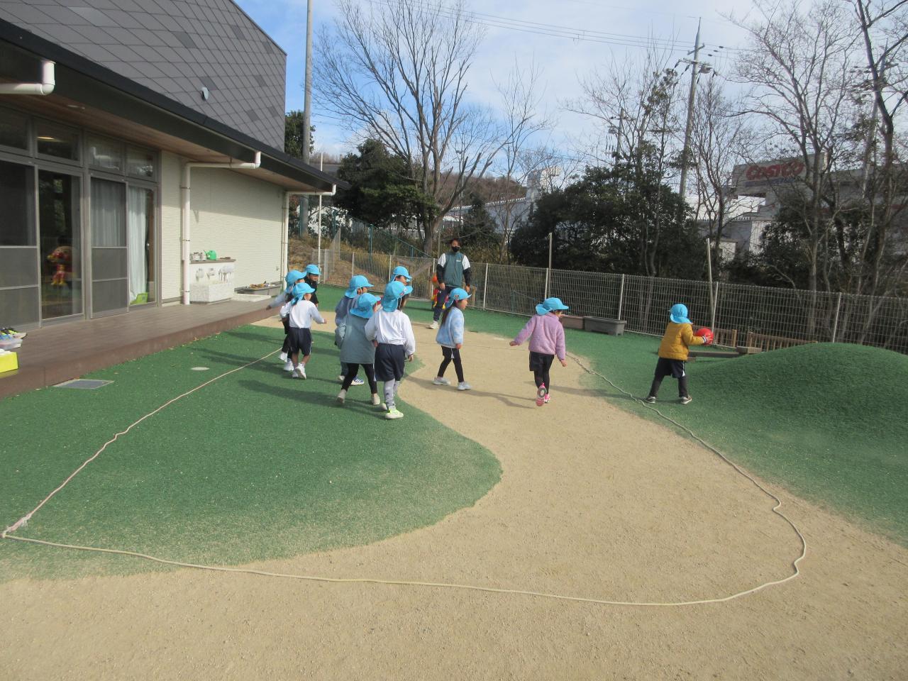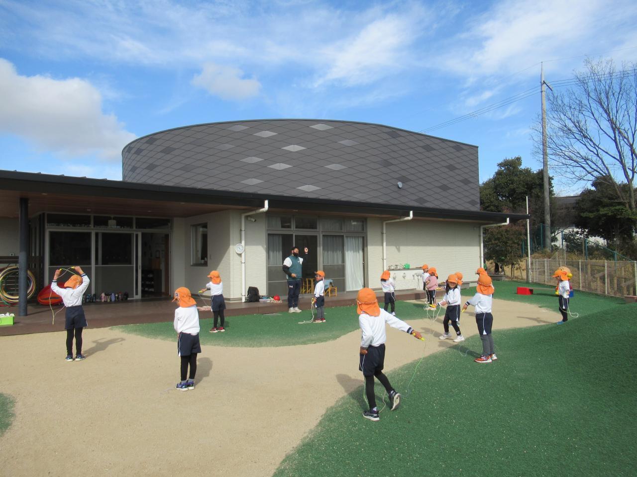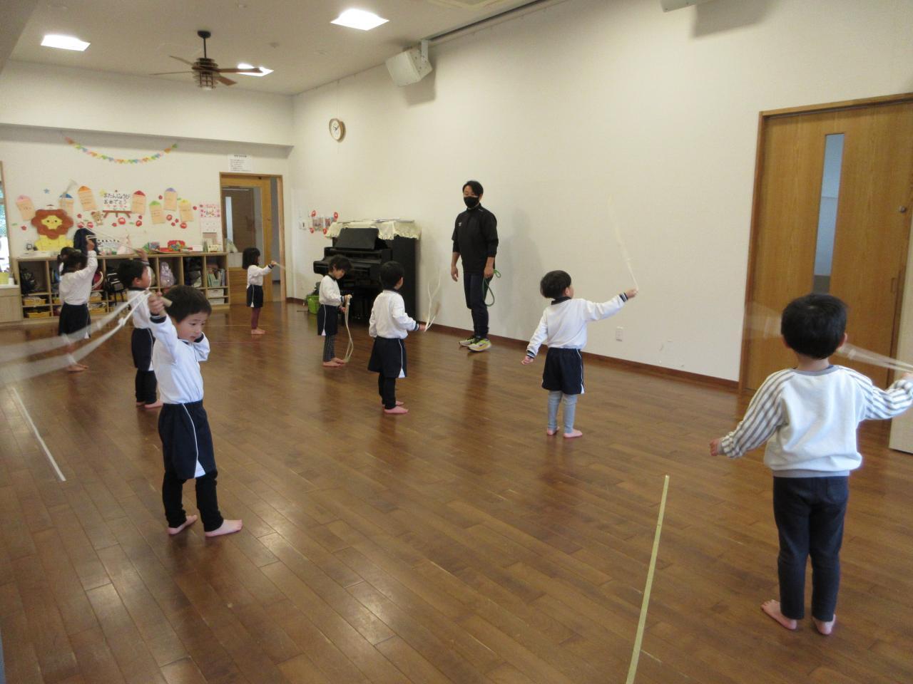 準備体操から始め、縄跳び練習に取り組みました。自分の挑戦したい技を選び、何度も挑戦しています。お友だち同士で「次はこの技!」「一緒に頑張ろう!」と声を掛け合いながら頑張っていました。また、技ができると石元先生や保育教諭に見てもらい、たくさん褒めてもらって嬉しそうな子どもたちでした。
