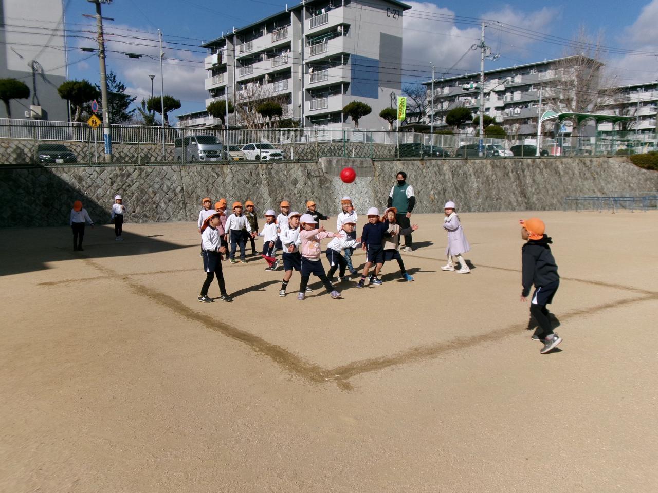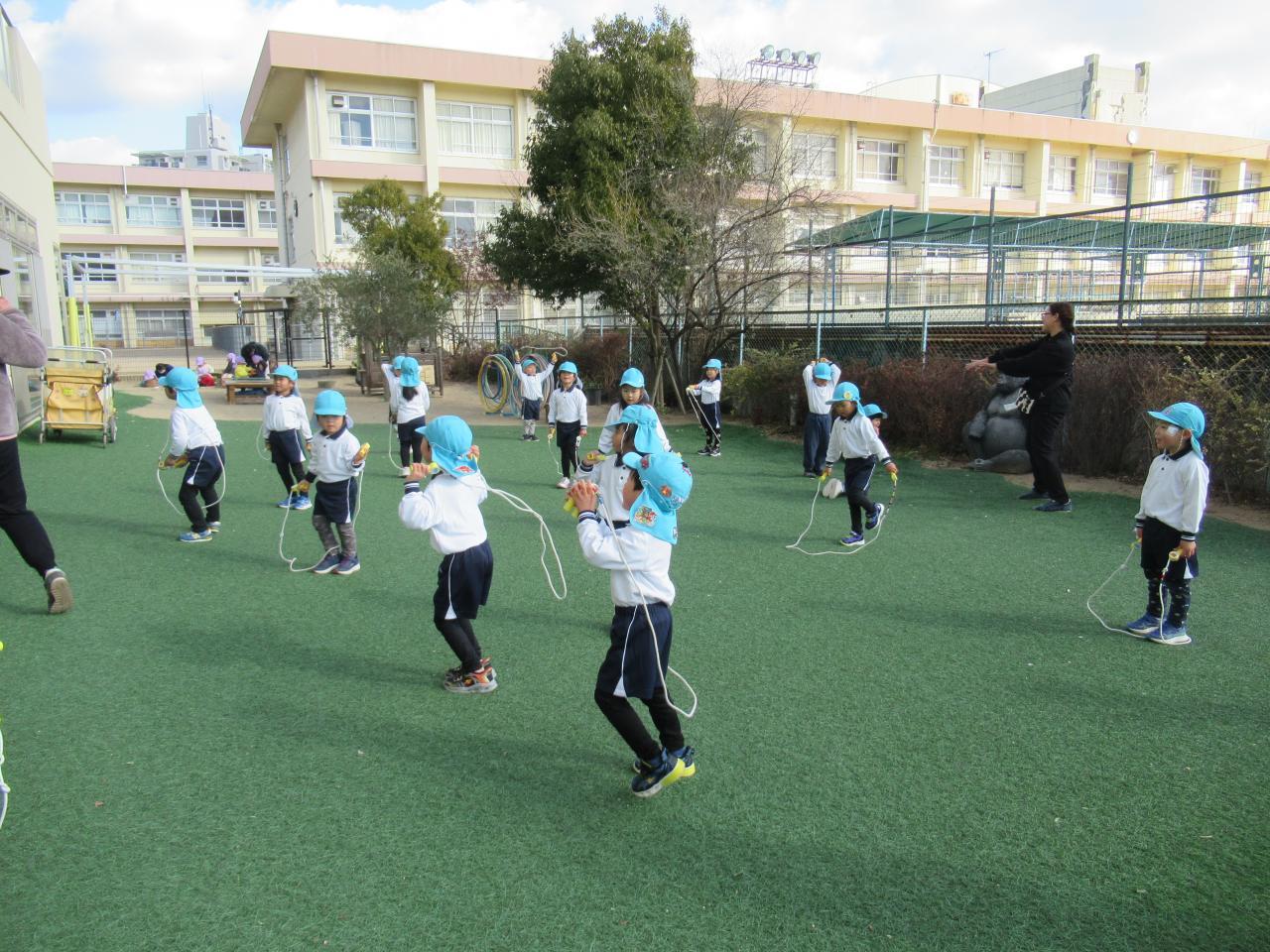 元気に挨拶を行い、初めに縄跳びチャンピオンに挑戦しました。回数を伸ばしながら楽しく参加しています。その後縄跳び表の練習を行い、前跳び、後ろ跳びの百回跳びに取り組む子が多く、何度も諦めずに練習し、お友だち同士で「がんばれ」「あとちょっとだよ」と声をかけ合いながら取り組んでいます。 最後にドッジボールをしました。「ボールを取ったらすぐ投げる、取れそうなボールは取る」を意識しており、白熱したゲームを行っています。どちらのチームも最後まで諦めることなくチームで協力しながら楽しんでいます。