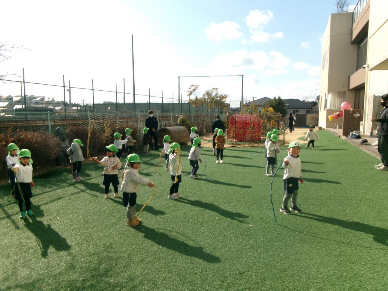 元気よく挨拶をしたあと縄跳びで線を作って前後左右にジャンプをしました。「いち、に、さん・・・」と回数を自分で数えながら取り組み、「10かいもできたよ!」と石元先生や保育教諭に嬉しそうに伝えています。片手で縄をまわす練習では、体の横や前で縄を回しています。くるくる縄が回るのを見て「せんぷうきみたい」「ぼくのせんぷうきはやいで!」と友だちとのやりとりも楽しみながら取り組む姿が見られます。縄跳びのあとは中当てをしました。コートの中にボールがくると、走って逃げたり、キャッチしたボールを保育教諭に投げたりして体を動かしました。