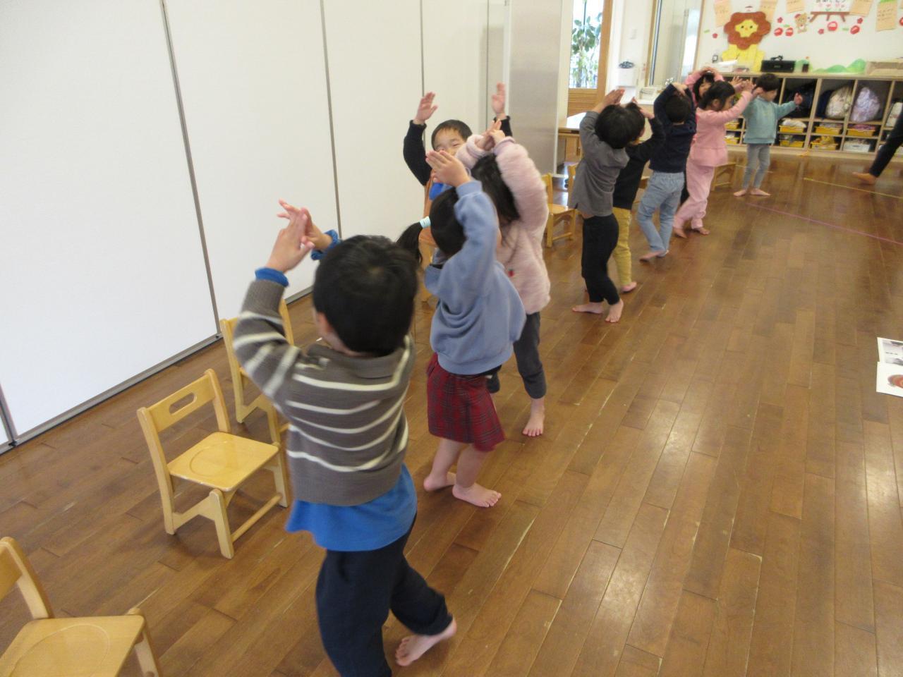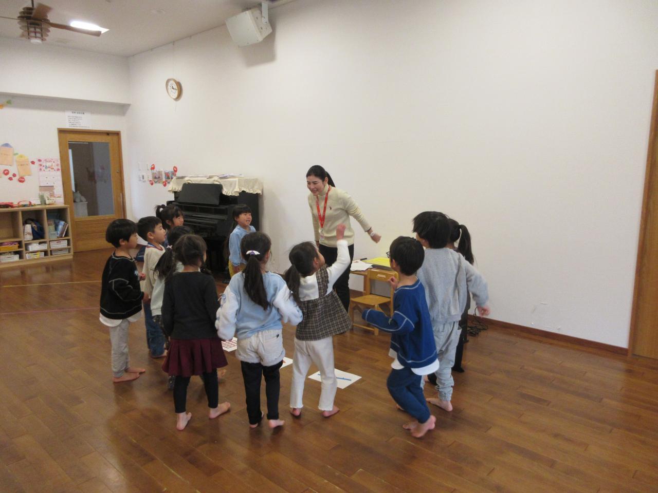 季節の単語「Winter(冬)」「January(1月)」「Snowman(雪だるま)」「Top(コマ)」を教えてもらいました。「雪だるま作った!」などと言いながら発音しています。「Top(コマ)」のときにはクルクル回りながら楽しんでいる子どもたちです。