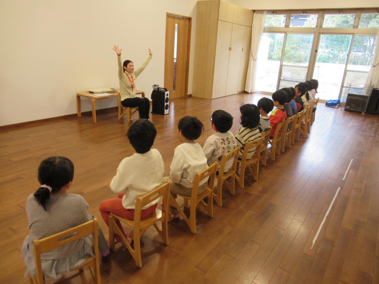 季節の単語「Winter(冬)」「January(1月)」「Snowman(雪だるま)」「Top(コマ)」を学びました。また公園にある遊具の名前「Jungle gym(ジャングルジム)」「Swing(ブランコ)」「Slide(滑り台)」「Sandbox(砂場)」「Seesaw(シーソー)」を体を動かしながら発音しました。ジャングルジムでは登る真似をし、滑り台では滑る真似をしながら楽しんでいます。他にも音楽に合わせて踊ったり絵本を見たりして楽しく英語に触れました。