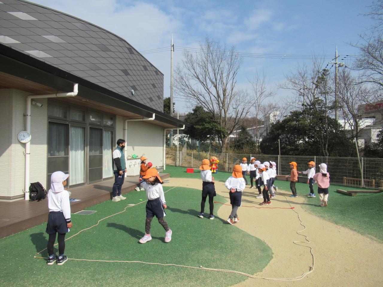 縄跳びをしました。跳んだ後にしゃがみ込んでしまわないようにすることや縄を回してすぐにジャンプすることを意識しています。数を自分でかぞえて、「さっきよりいっぱいできた!」と言いながら取り組んでいる子どもたちです。