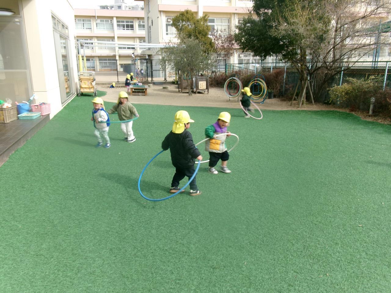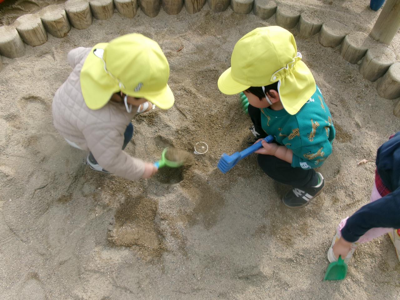 その後、戸外へ行きました。フラフープを使って電車ごっこを楽しんでおり「だれかのりますかー!」「○○でんしゃです!」と車掌さんになって友だちと遊んでいます。また砂場の中にお皿を隠して友だちとスコップを使って探し「あ!でてきた!」と発掘遊びを楽しんでいます。