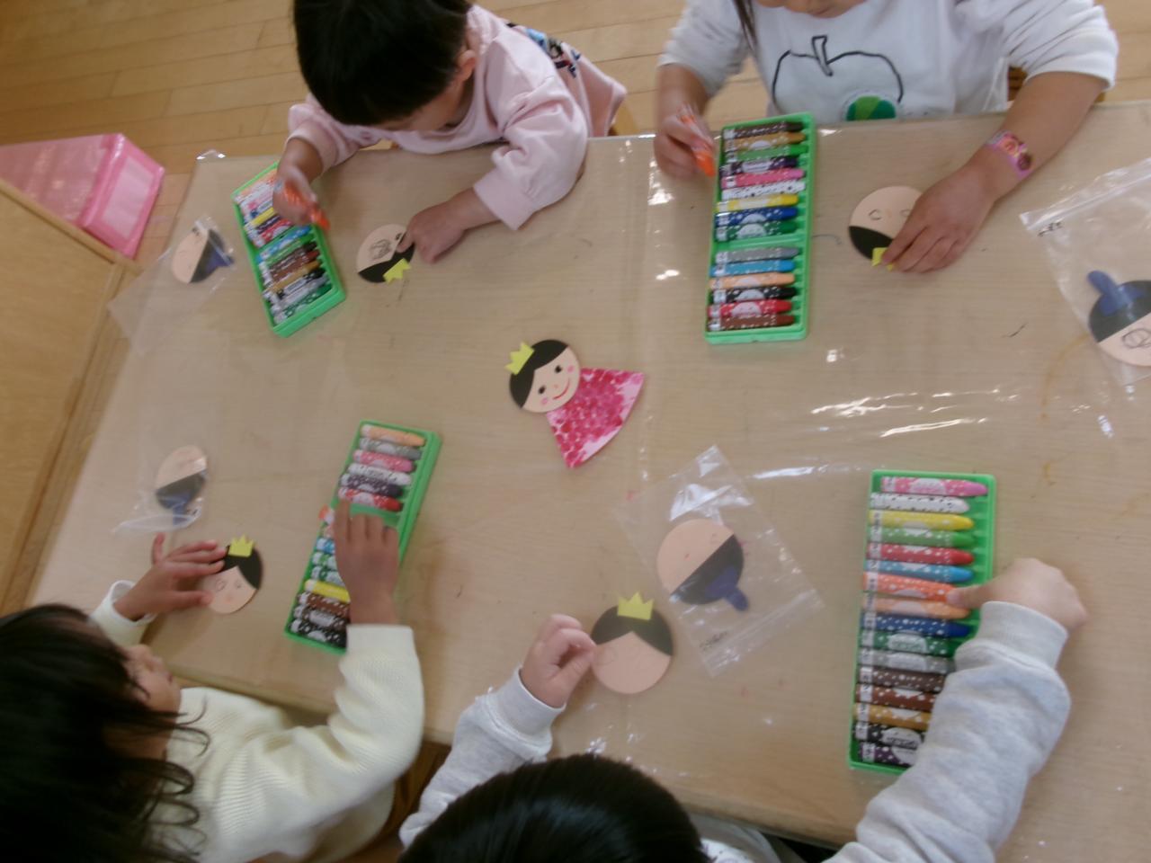 ひな祭りの製作でクレヨンを使ってお内裏様とお雛様の顔を描きました。見本をみせると「あ!くつの所にかざってるやつ!」「かわいいー!」と興味を持っています。目や鼻の位置を見本をみながら確認したり、ほっぺの色を2色から自分で選んだりして楽しみながら描くことができています。描き終えると「せんせー!できた!」「かわいい?」と友だちや保育者と見せ合っています。