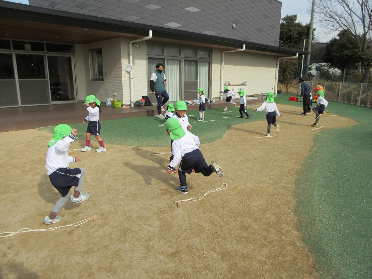 縄を置いて、前後左右にジャンプしたり、前跳びの練習をしました。少しずつ回数が多く跳べるようになってきており、数をかぞえながらしています。ケンケン跳びで、置いた縄を前後に跳ぶ練習をしました。「ケンケンできる!」「1回ジャンプできた!」と言いながら挑戦していた子どもたちです。