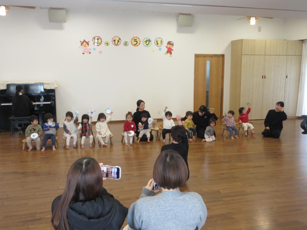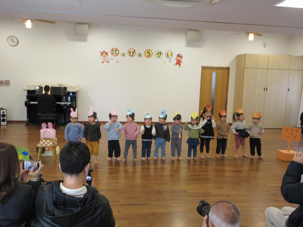 朝から「発表会、パパとママ来てくれるの楽しみ!」とお話をしていた子どもたち。発表会が始まると、緊張する姿もありましたが大きな声で歌をうたったり、楽器遊びに取り組むことができました。表現遊びでは笑顔も見られ、お友だちと一緒に台詞を言い楽しく発表することができました。お部屋に帰った後も「頑張った!楽しかった!」と話し、達成感を感じる子どもたちです。
