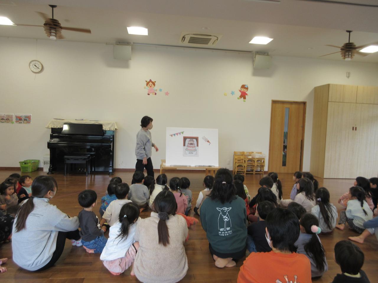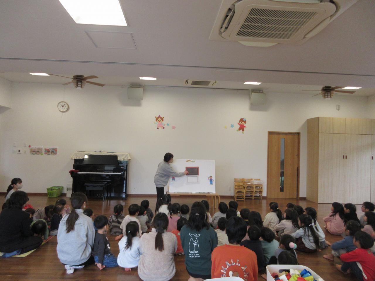 今日は2月生まれのお誕生会でした。好きな食べ物は何ですか?や好きな動物は何ですか?などのインタビューに、「グラタン」「ピザ」「いぬ」と嬉しそうに答えています。皆で「たんたんたんじょうび」の歌をうたい「おめでとう!」「ありがとう!」を大きな声で言いました。また「ふしぎなでんしレンジ」のパネルシアターを見ました。魔法をかける歌をみんなで合唱し、魔法の電子レンジから出てくる色々なお料理を見て、「おいしそ~!」と笑顔になる子どもたちです。最後にはイチゴがたっぷりとのった大きなデコレーションケーキが出てきて、ロウソクを吹き消してみんなで楽しみました。