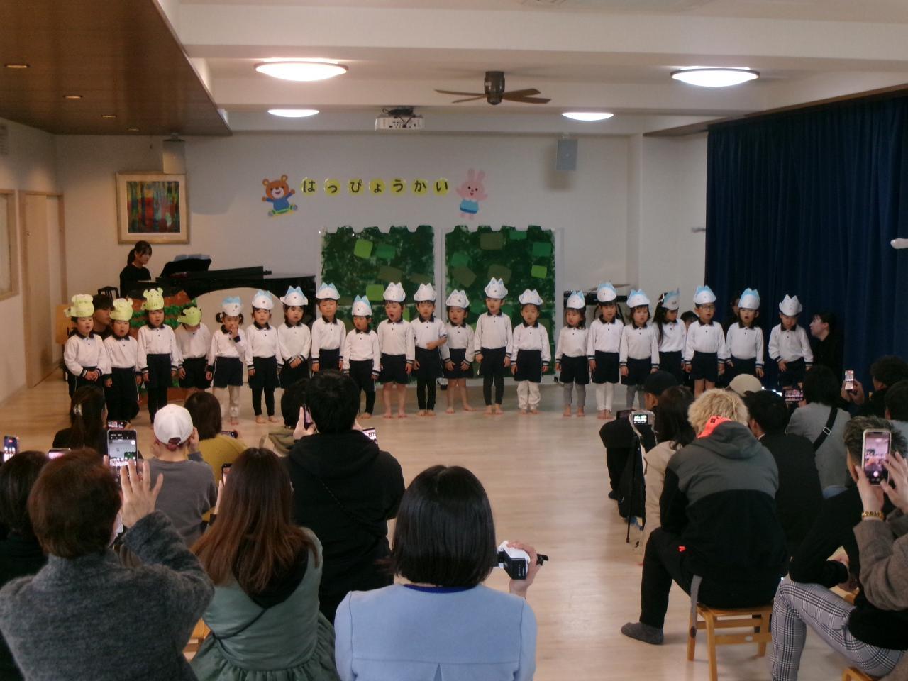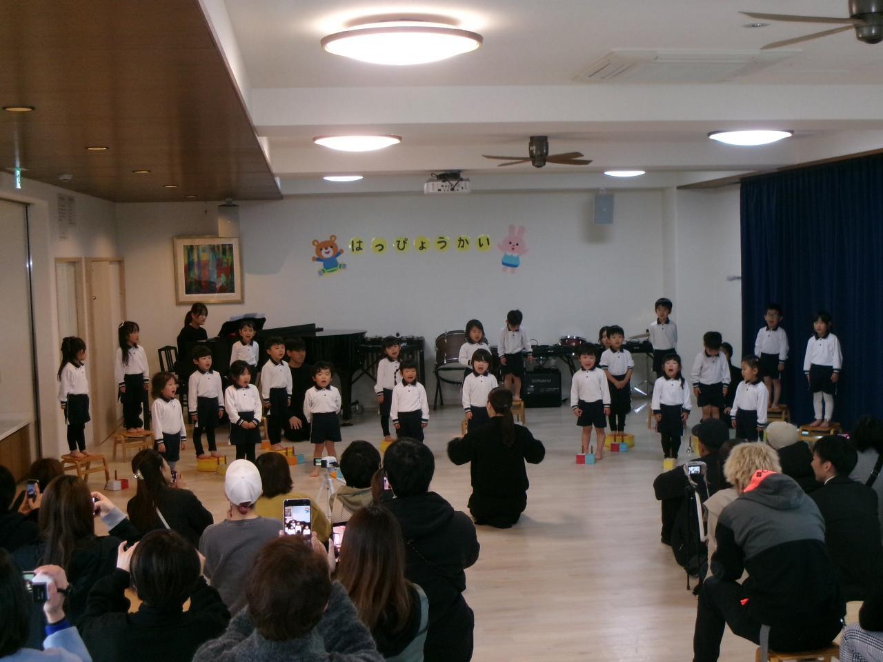 入場して前に並び、『Teddybear,Teddybear』をしました。英語の歌をうたいながら可愛らしい振り付けをすることができています。劇『11ぴきのねこ ふくろのなか』ではそれぞれの役になって動きを楽しみ、友だちと一緒に台詞を言うことができています。歌『ともだちいいね』ではしっかりと前を向いて立ち、音楽指導で教えてもらったことを意識しながら歌う姿が見られました。ハンドベル『Beauty and the Beast』では、一人ひとりが自分の音を大切にし、指揮に合わせて音を鳴らすことができました。最後に拍手をしてもらうと自然と笑顔になり、少しホッとしたような表情をしていた子どもたち。部屋に戻り、それぞれ頑張ったことを保育教諭に伝えて自信に繋げることができました。