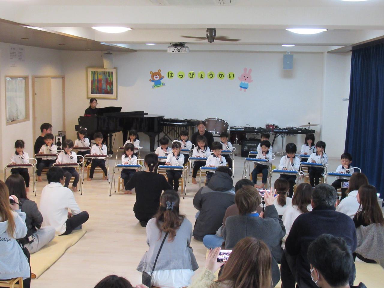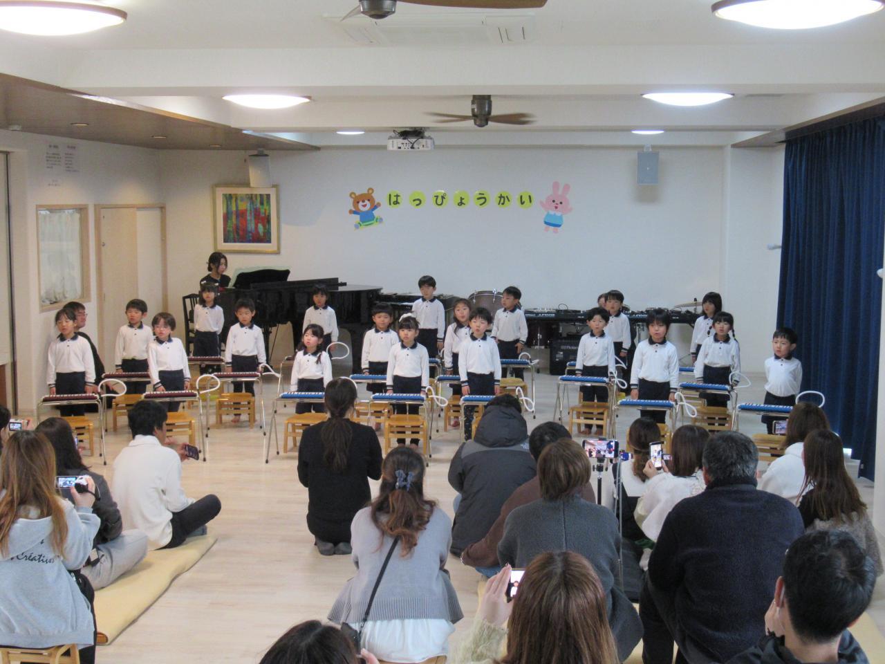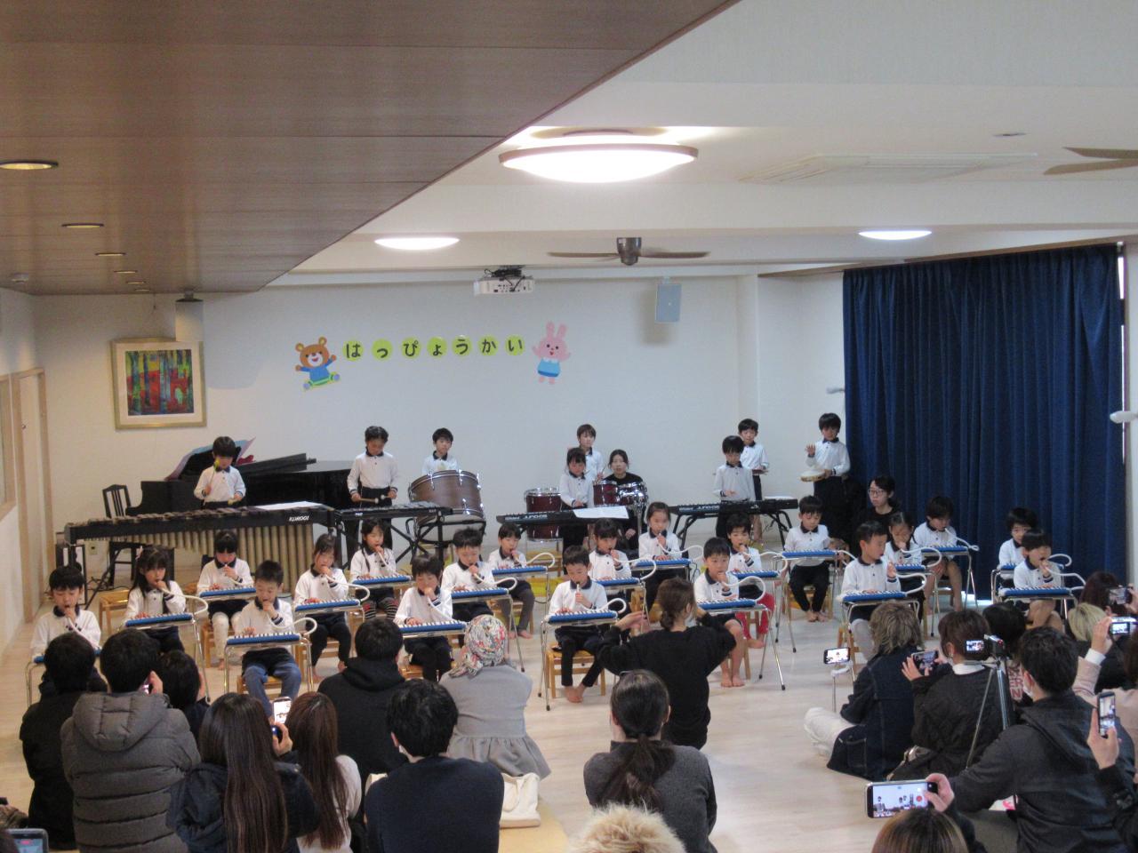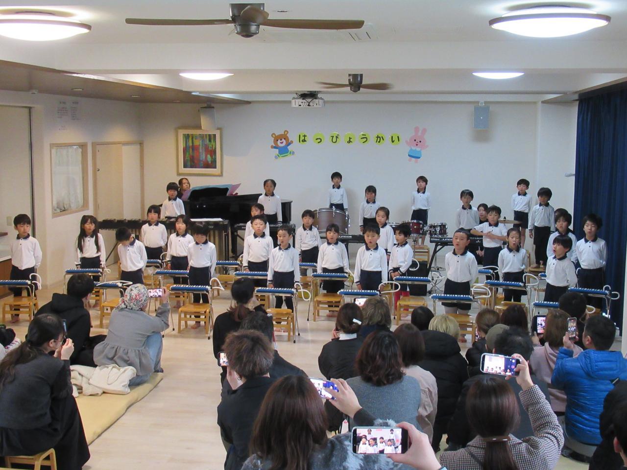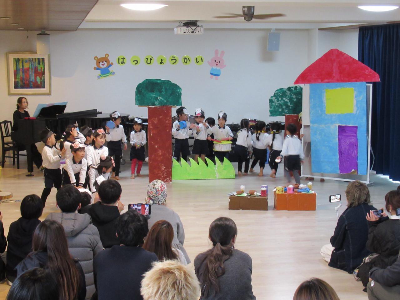 発表会の時間が近づいてくると「めっちゃドキドキする!」「楽しみやな!」と自分の気持ちを話したり、「いつもがんばってるからいけるよ!」とお友だちと励まし合っていた子どもたちは、保護者の方を見つけると嬉しそうな笑顔を見せながら入場する姿が見られました。英語『Baby Bumblebee』ではプログラムの最初ということもあり、少し緊張している様子も見られましたが、歌詞に合わせた振りつけを踊りながら歌うことができ、劇『ともだちほしいなおおかみくん』も大きな声で劇の台詞を言ったり歌ったりしながら、楽しくのびのびと表現することができました。『だいじなともだち』の歌は元気な声やきれいな声をフレーズによって使い分けながら上手にうたうことができ、鍵盤ハーモニカ奏『鉄腕アトム』では他のパートとの音の重なりを感じながらリズムよく演奏することができていました。『Believe』の歌も最後まできれいにうたうことができ、保護者の方からの温かい拍手に子どもたちも自然と笑顔がこぼれ、達成感や自信に満ち溢れた表情が見られました。