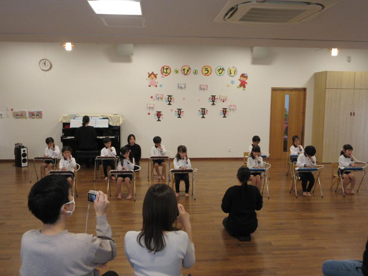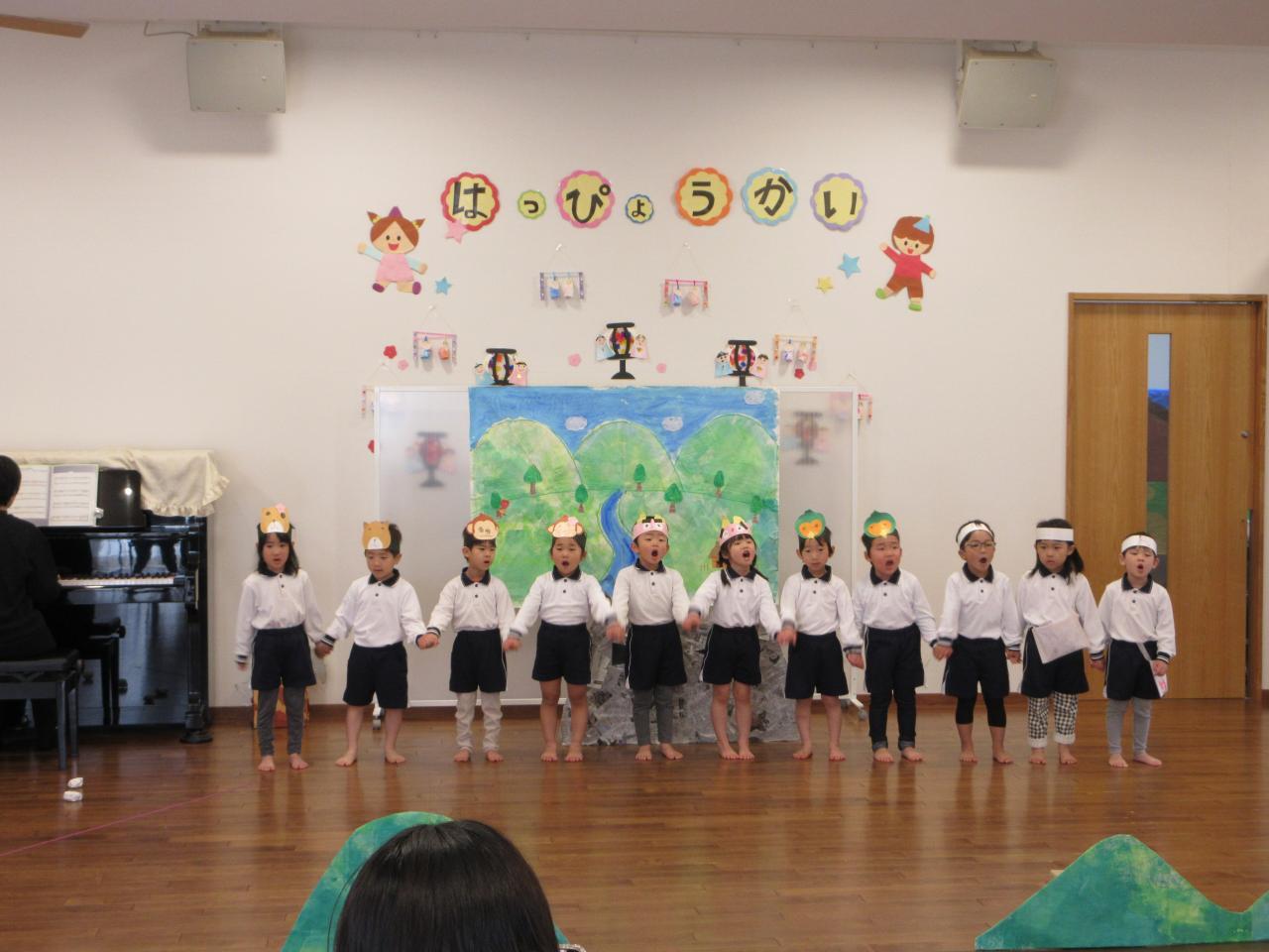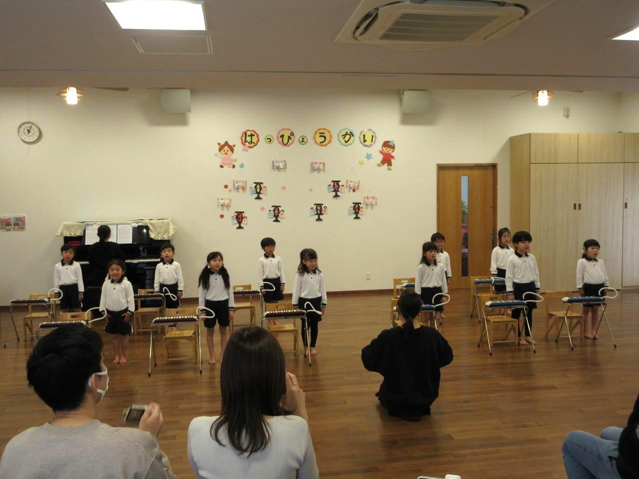 登園すると「緊張するなあ!頑張ろうね!」とお友だちと声を掛け合い本番を楽しみにしていました。英語の曲はダンスをしながら笑顔で歌う姿が見られました。劇では、大きな声で台詞や歌を言い、堂々と役を演じています。歌「だいすきがいっぱい」は、ピアノの音をよく聞きながらとてもきれいな声で歌い、鍵盤ハーモニカでは、指揮を見ながら集中してみんなで息を合わせて取り組む姿が見られました。「Believe」も最後まできれいな声で歌うことができました。保護者の方の拍手を聞き笑顔になる姿も見られ、お部屋に戻ってから「楽しかった!」と友だちとお話をする子どもたちです。