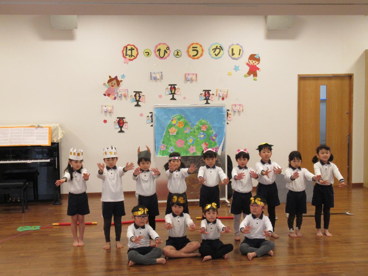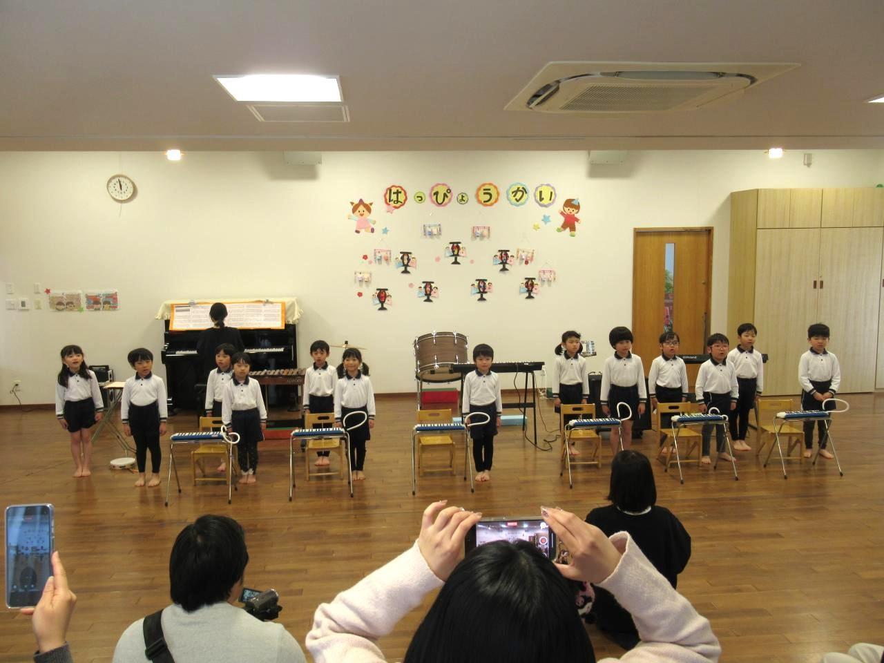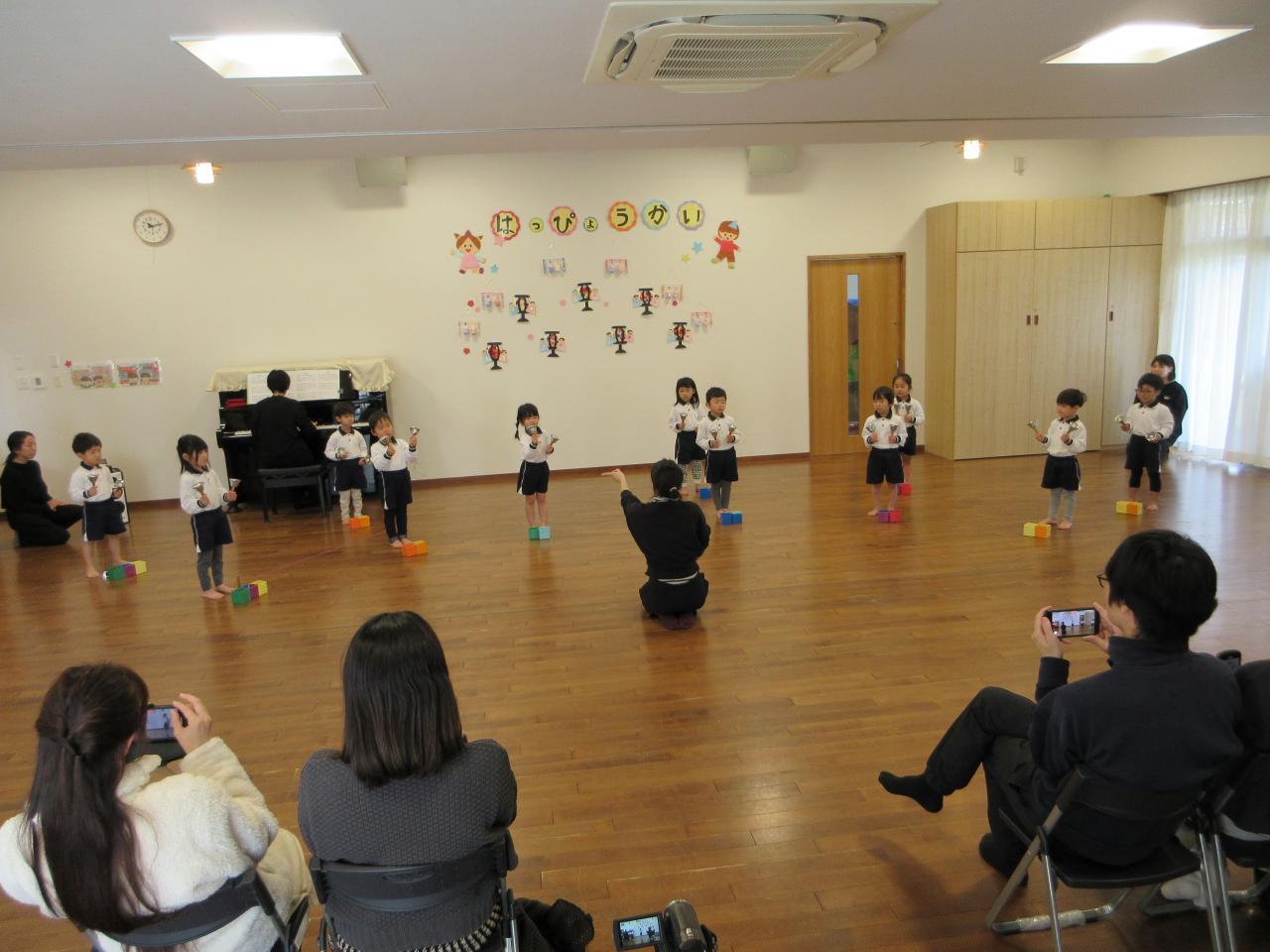 登園すると「緊張するなあ!頑張ろうね!」とお友だちと声を掛け合い本番を楽しみにしていました。英語の曲はダンスをしながら笑顔で歌う姿が見られました。劇では、大きな声で台詞や歌を言い、堂々と役を演じています。歌「だいすきがいっぱい」は、ピアノの音をよく聞きながらとてもきれいな声で歌い、鍵盤ハーモニカでは、指揮を見ながら集中してみんなで息を合わせて取り組む姿が見られました。「Believe」も最後まできれいな声で歌うことができました。保護者の方の拍手を聞き笑顔になる姿も見られ、お部屋に戻ってから「楽しかった!」と友だちとお話をする子どもたちです。