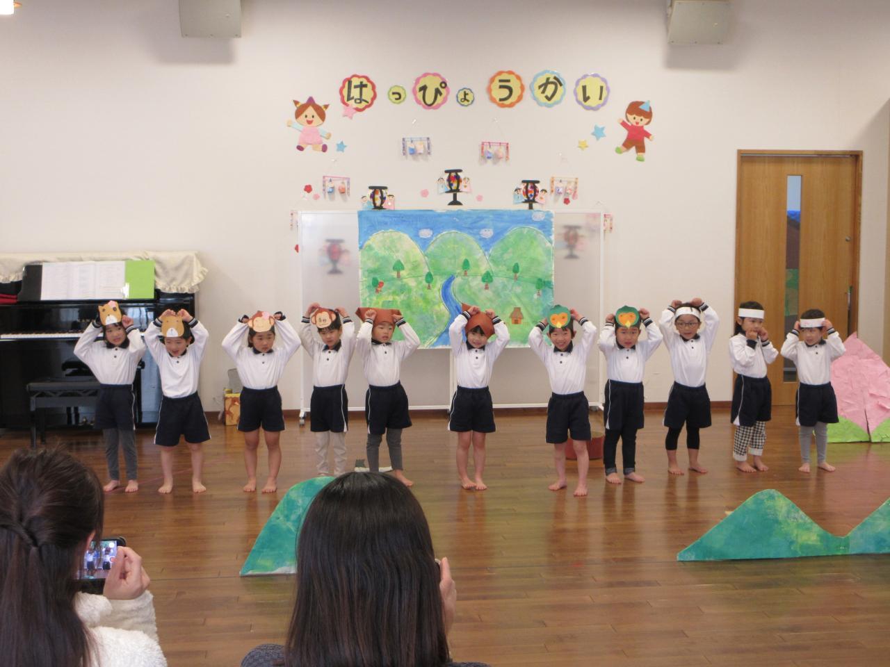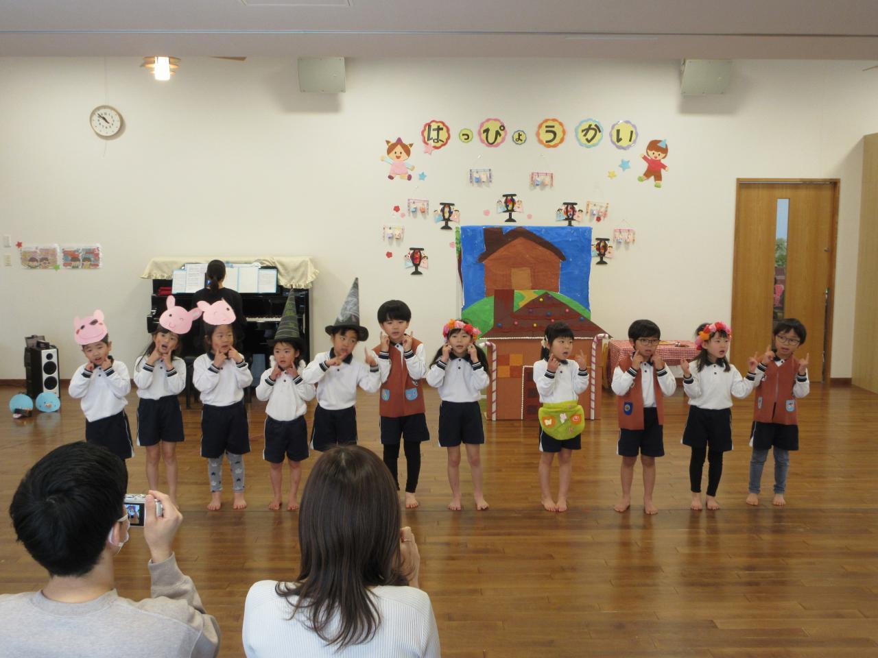 「パパとママが見に来る!」「来てくれる日いつ?」と何日も前から楽しみにしていた子どもたち。「今日来る日!頑張る!」とお友だちや保育教諭と話していました。少し緊張した姿もありましたが、歌は振りをつけて大きな声でうたったり、劇ではお友だちと一緒に台詞を言うことができました。終わった後には「大きい声で言えた!」「上手にできた!」「見に来てくれた!」と嬉しそうに話していた子どもたちです。