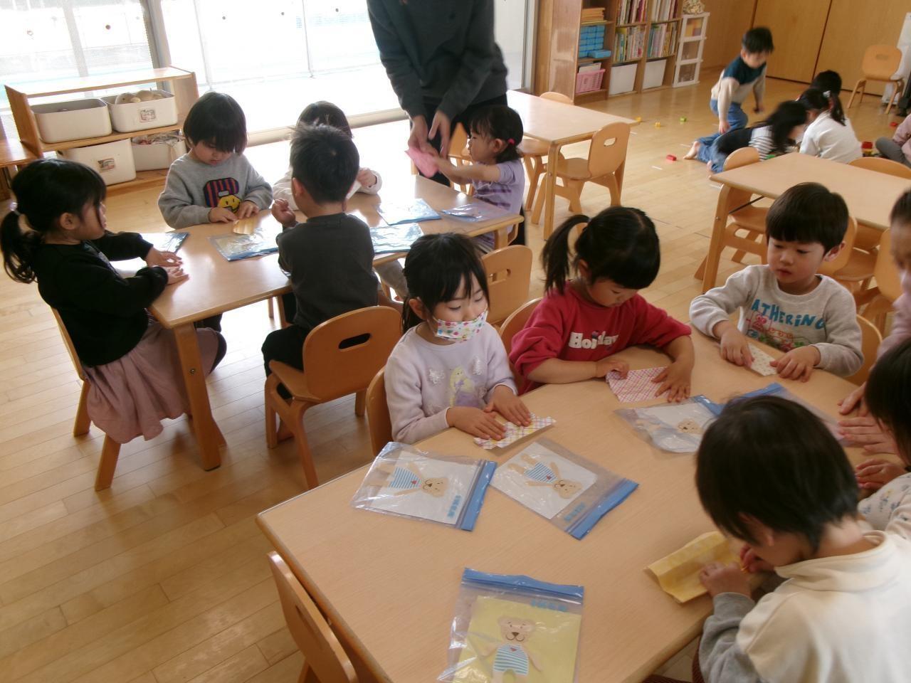3月の製作で折り紙を使ってちょうちょうをつくりました。好きな柄の折り紙と無地の折り紙を2枚じゃばら折りにします。保育教諭の見本を見ながら線の向きや折る幅を確認し、端と端が揃うように丁寧に折り進めています。「これであってる?」と近くの友だちや保育教諭に確認をしながら自分で折る姿が見られます。
