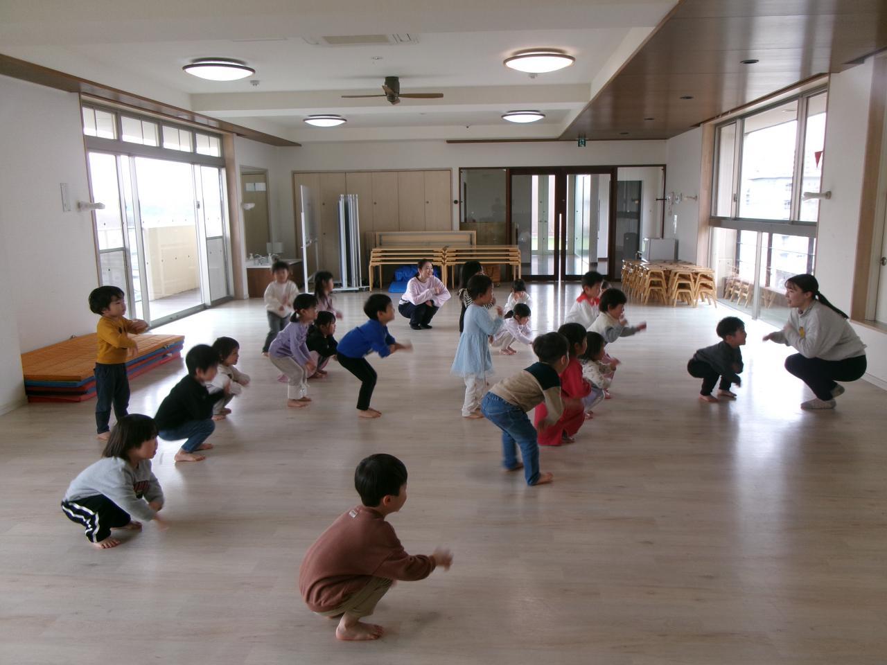 遊戯室で体操をしました。運動会で踊った『Love me , Love you』を流すと、「うんどうかいのやつや!」「おぼえてるで!」と大喜びの子どもたちです。振りを思い出しながら大きく体を動かして体操を楽しんでいます。