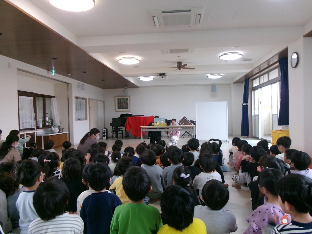 『よがあけた』『うれしいひなまつり』をうたった後、各クラスの製作を発表しました。「染め紙したよ」「顔を描いたよ」と、どのような作品を作ったのか話しています。紙芝居『なぜ、おひなさまをかざるの?』を見て、ひなまつりの由来について知ることが出来ました。「ひなまつりは何月何日でしょう?」や「おひな様に飾る花は梅でしょうか?桃でしょうか?」など、ひなまつりに関するクイズをしました。「正しいひしもちの順番はどっちでしょう?」というクイズでは「白が上だと思う!」「どっちだろう?」と友だち同士で考えながら楽しんでいる子どもたちです。