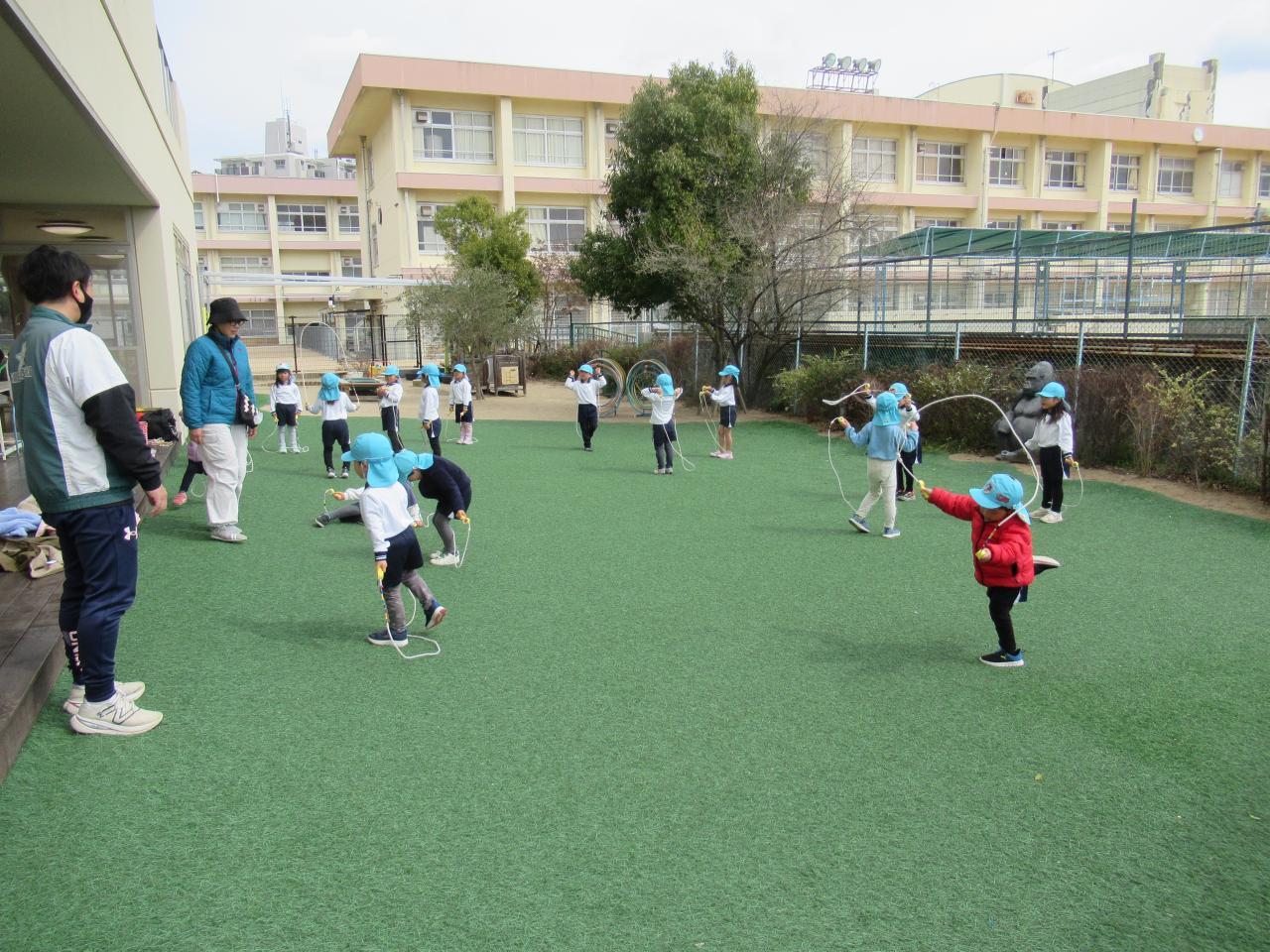今日はうさぎ組最後の体育指導でした。石元先生に元気よく挨拶し、準備体操した後、地面に置いた縄跳びを前後左右、けんけんで跳ぶことに取り組みました。「もうできるで!」「先生見ててな」と自信をもって取り組んでいます。片方の手で縄跳びを回す練習では、利き手でない方の手でも徐々に回すことができるようになってきています。縄跳びを回して跳ぶ練習では、練習を重ねる中で跳ぶタイミングを掴んできており、回してすぐ跳ぶことや連続で跳ぶことができています。また、跳ぶことに苦戦している友だちに「教えてあげようか」「見ててな」と友だち同士で教え合う姿が見られます。中当てでは、跳んできたボールを意欲的にキャッチする姿やボールを見て逃げることを楽しんでいます。最後に、「一年間ありがとうございました」と石元先生に笑顔で伝えました。