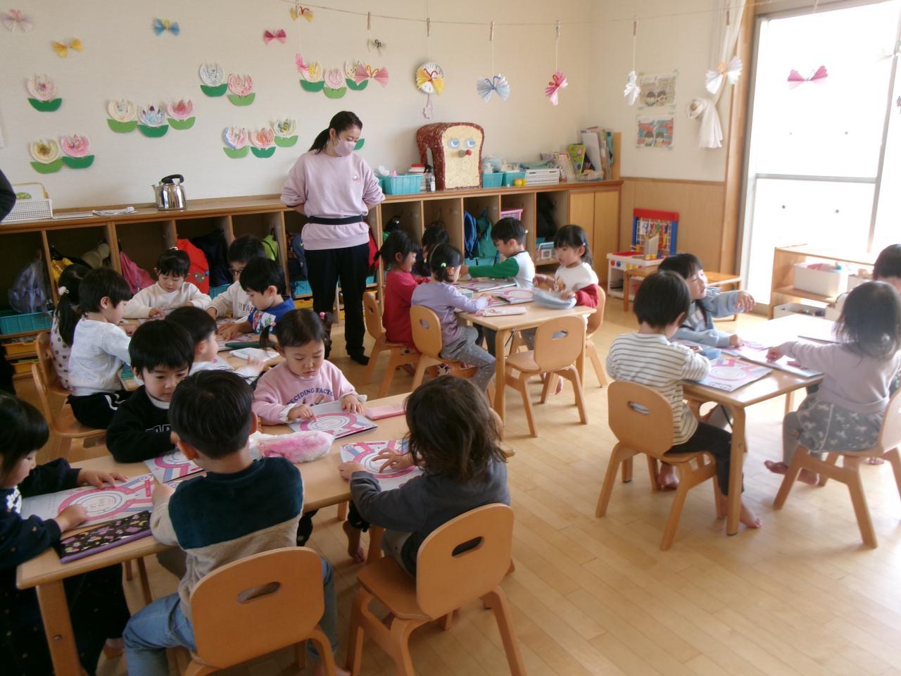ワークの最後のページをしました。最後は『おたのしみめいろ』というタイトルでメダルの絵の中に迷路があり、ゴールまでの道を指でなぞってから、鉛筆を使って丁寧に書いていきます。ゴールができた子は他のページを振り返り、どんな線を書いたか、やり忘れている所がないかを確認しました。「ぜんぶできてた!」「ぱんださんでもワークしたいな」と達成感を味わっています。
