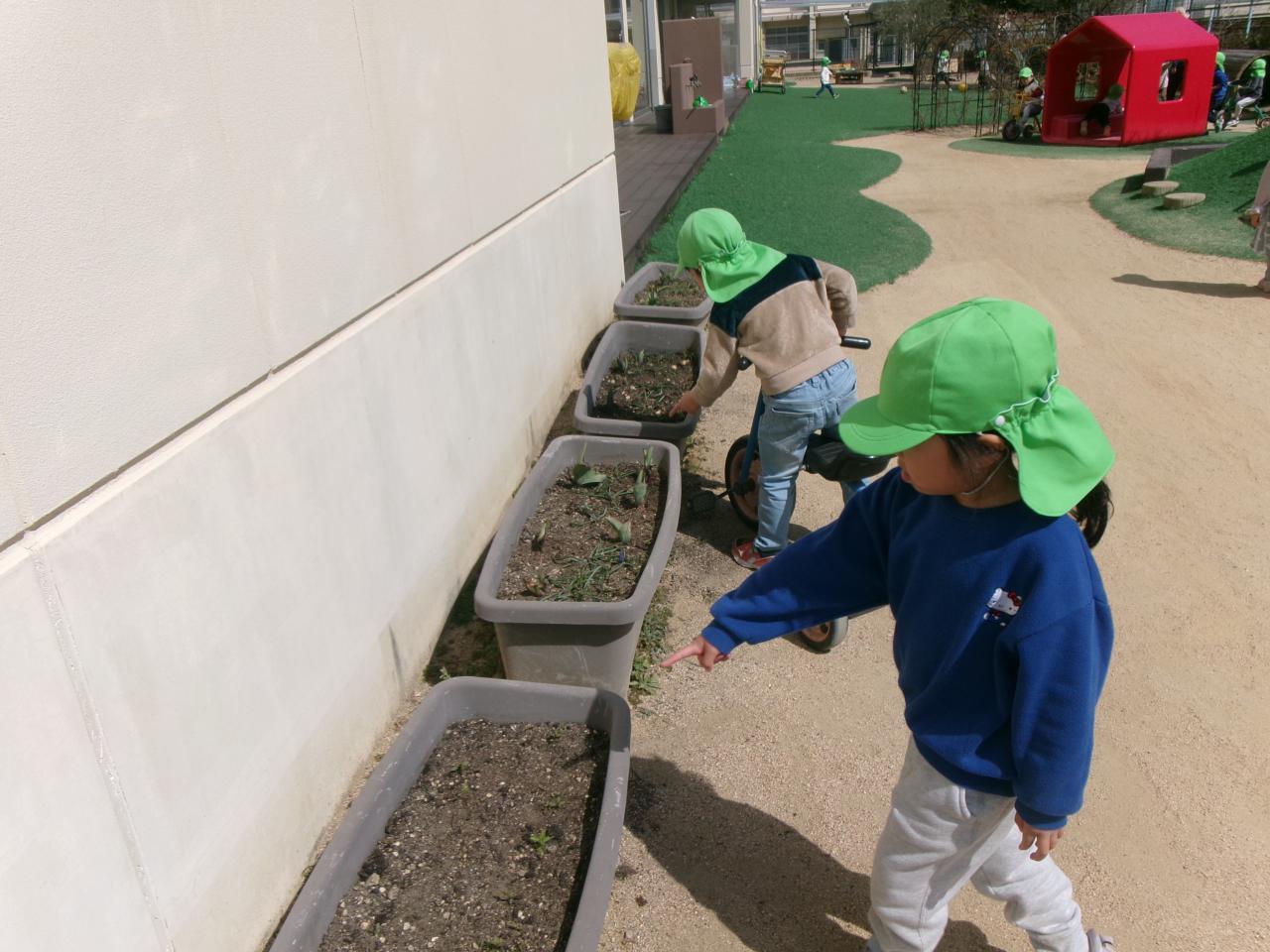 戸外遊びでは、アスレチックやしっぽ取り、三輪車などでのびのびと体を動かしています。チューリップの芽の数をかぞえたり、パンジーの花の色の違いに気付いてやりとりをするなど、春の自然物にも興味を持っている子どもたちです。