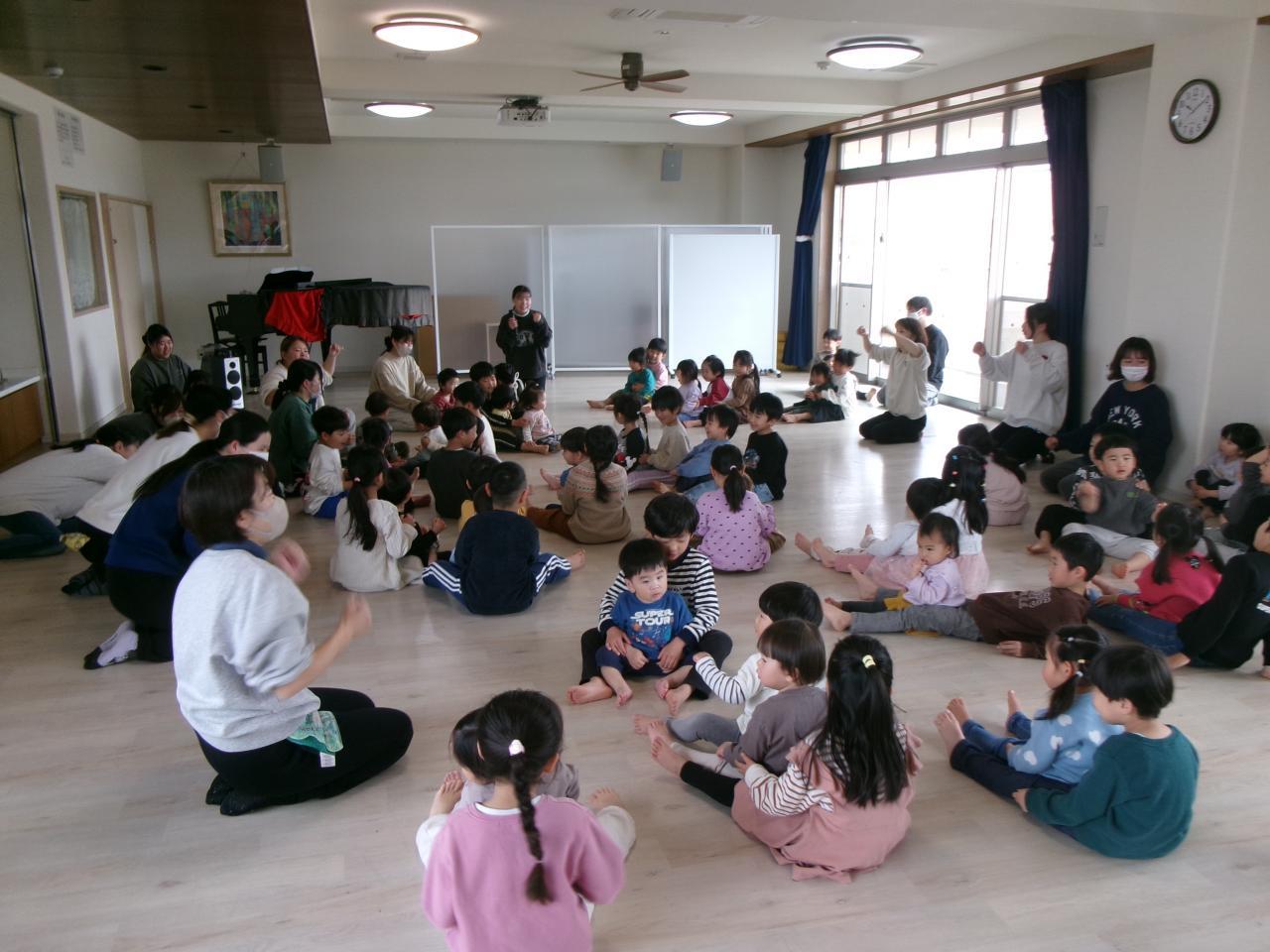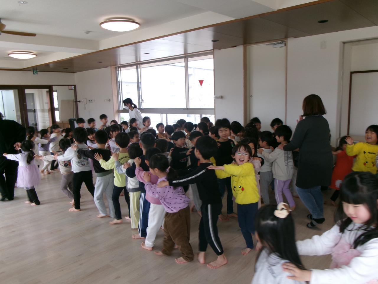 朝の歌をうたい、初めにいちご組・りんご組・らいおん組で体操をしました。『こちょこちょでんしゃ』『ばすにのって』をして、らいおん組のお友だちは、いちご組やりんご組のお友だちの横に行き、一緒に体操をしています。次にうさぎ組・ぱんだ組・らいおん組でじゃんけん列車をしました。ピアノの音に合わせて歌をうたい、他クラスのお友だちとじゃんけんをします。最後はみんながつながって長い列車ができました。