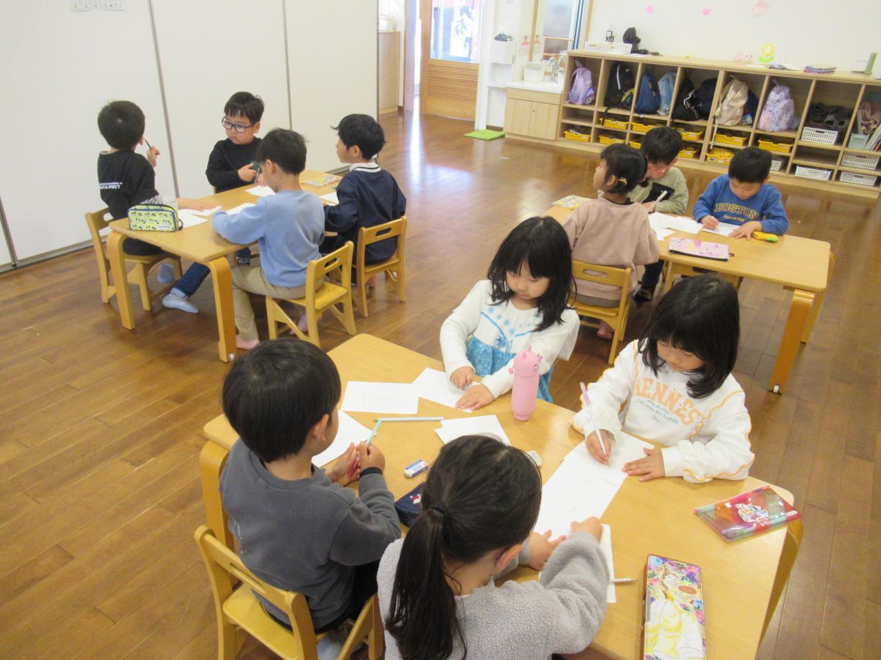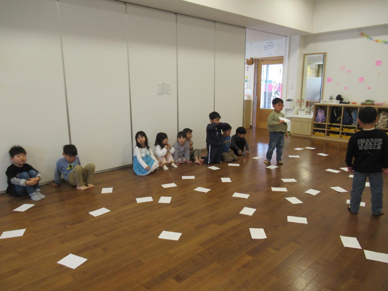 今日は言葉遊びをしました。まずはグループに分かれて五十音を紙に書いていきました。誰がどの文字を書くのか相談し合いながら書き進めています。そしてそのカードを床に並べて様々な言葉を作りました。初めは2人ずつで保育教諭の言った言葉を探しました。次に5人グループと6人グループに分かれて自分たちで言葉を考えて作り、「らんどせる」「いちねんせい」の言葉が出来上がりました。小学生にまつわる単語が出てきており、小学校に行くことが楽しみな子どもたちです。また、戸外ではさくらんぼ組と一緒にドッジボールをしました。ぶどう組の子たちが率先してルールを教えたり、ボールを渡したり年長らしい姿がたくさん見られました。