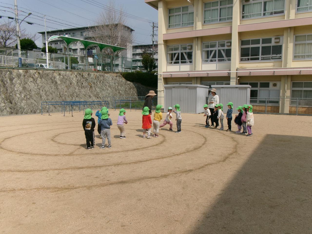 第二グラウンドでぐるぐるジャンケンをしました。渦巻きの内側と外側に分かれ、各チーム1人ずつ道に沿って進み、お友だちと出会った所でジャンケンをするというゲームです。同じチームの友だちに「がんばれ!」「いっぱいすすんで!」と声をかけながら遊びを楽しんでいます。