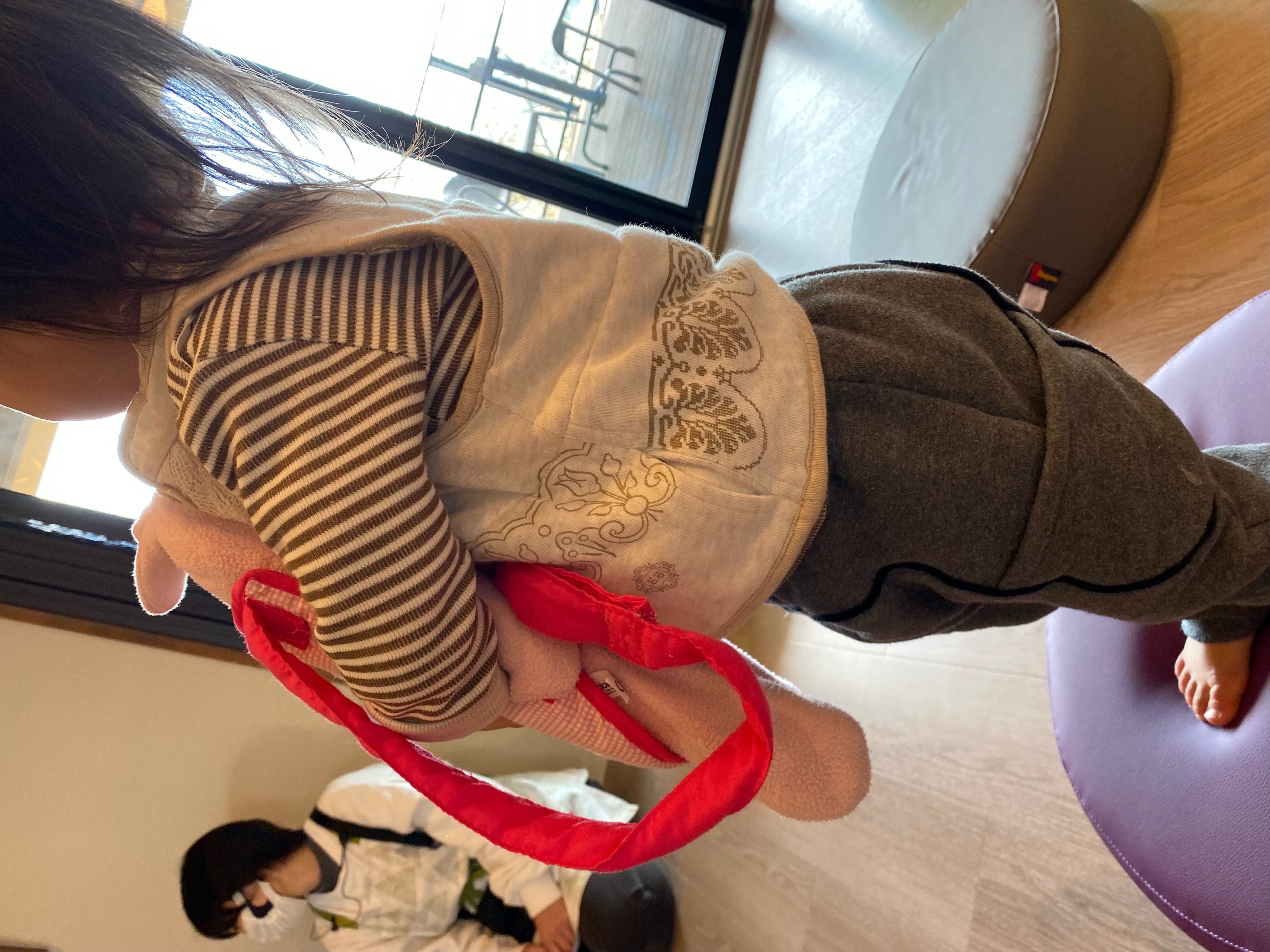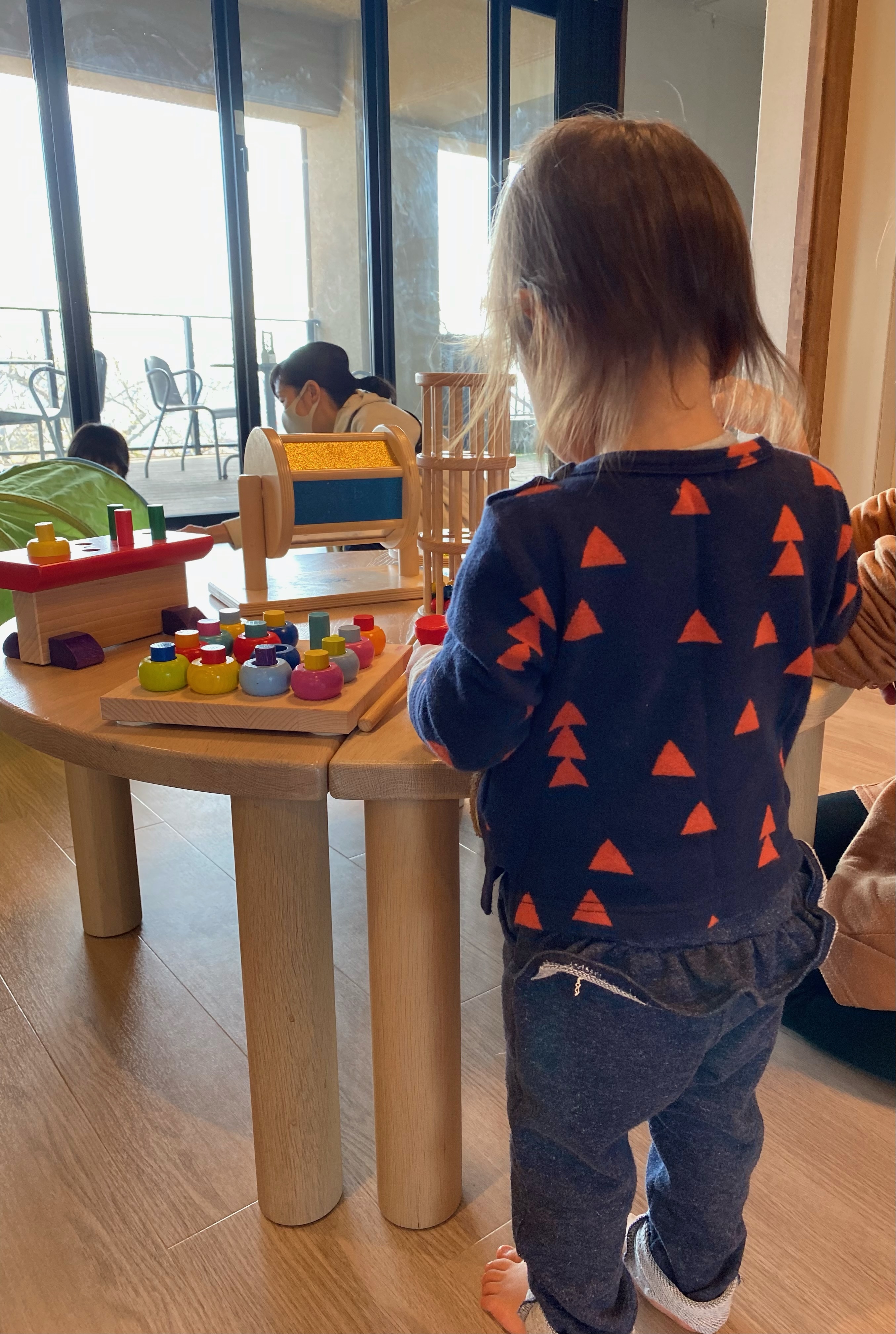 12月23日は遊びのひろばを開催しました。ここでは、地域の未就園児の親子を対象に、こども園に遊びに来てもらい玩具を使って自由に遊んでもらっています。今回は3組の親子が遊びに来てくれました。